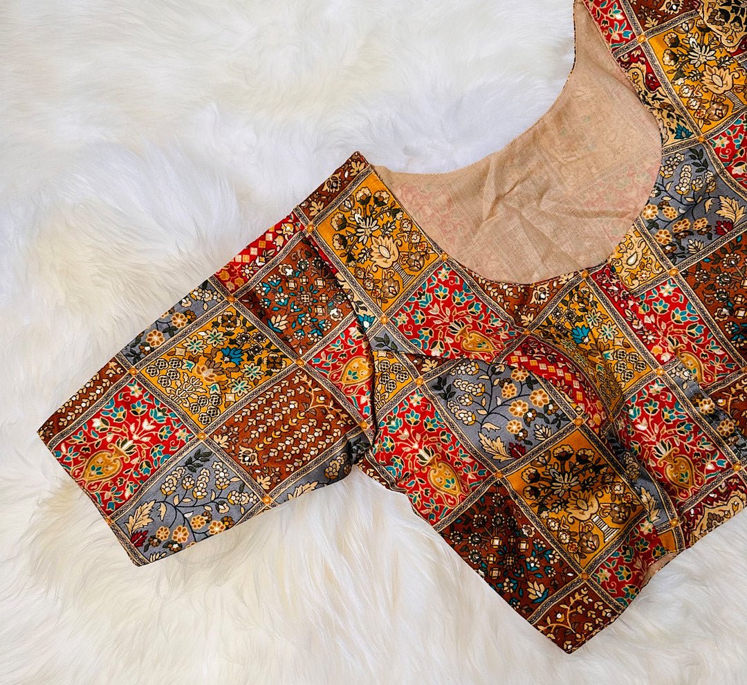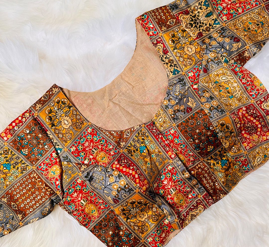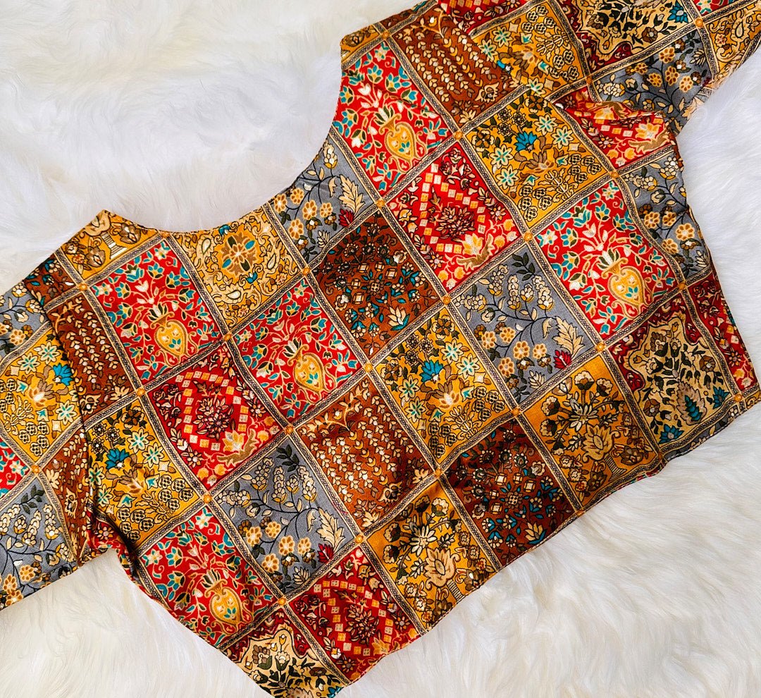 old and Beautiful: Embrace Your Ethnic Style with the Mustard Yellow and Red Full Patola High Neck Blouse - swadeshsouq.com