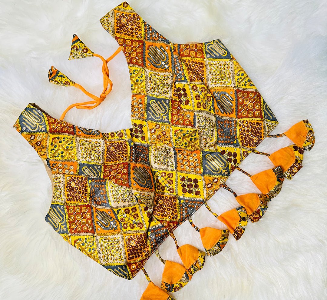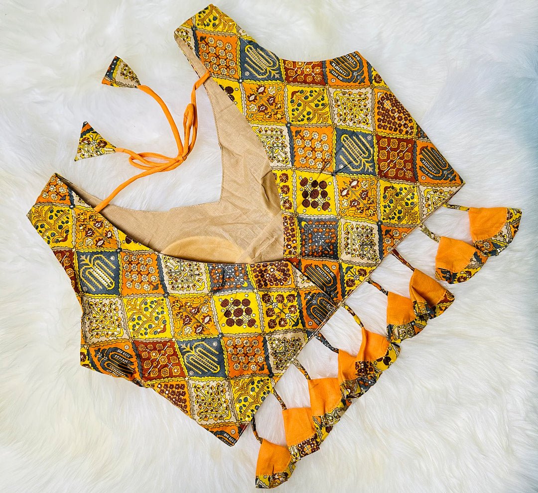 The Yellow Cotton Patola Blouse with Frilled Latkans is a refreshing and effortlessly chic piece that is perfect for adding a pop of color to your wardrobe. Made with high-quality cotton, this blouse features a beautiful patola print in shades of yellow.