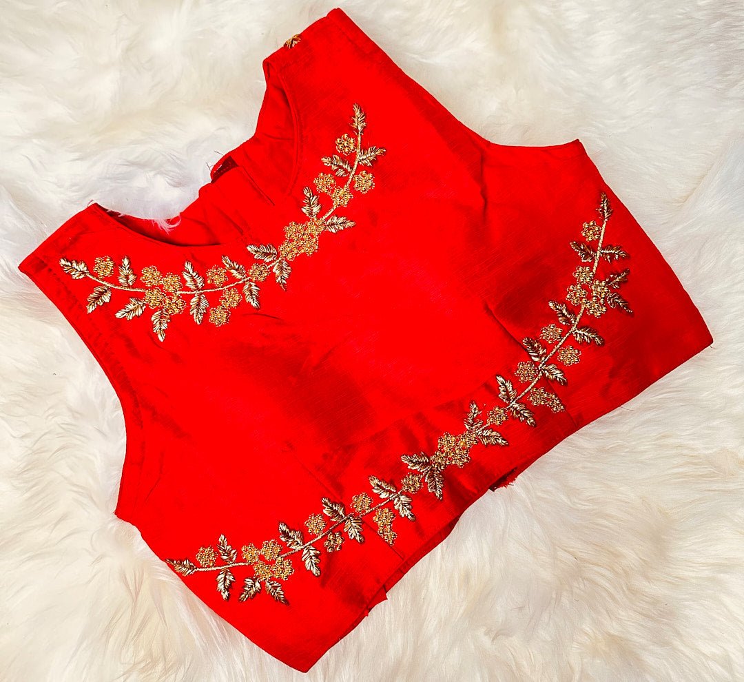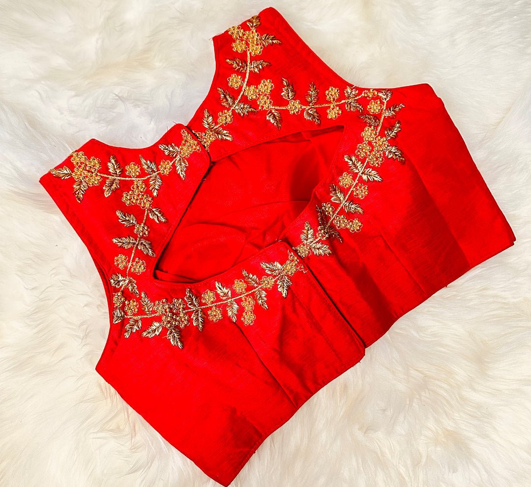 This red raw silk blouse is an exquisite masterpiece that exudes elegance and grace. The golden zardosi work adds a touch of opulence to its already striking design. The intricate details and patterns of the zardosi work complement the rich red silk fabric perfectly, creating a harmonious and captivating ensemble. With its stunning beauty and flattering fit, this blouse is sure to make you feel like a true fashion diva. It's perfect for any occasion where you want to unleash your inner glamour and make a bold statement. So, embrace your beauty and grace with this radiant red blouse adorned with golden zardosi work.