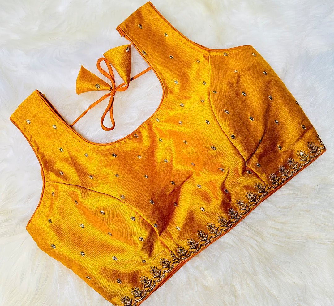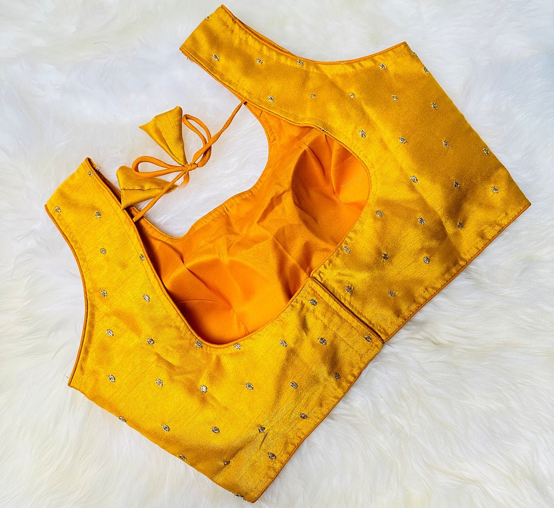 Radiant Jaipuri Elegance: Embrace Your Inner Glow with the Yellow Raw Silk Blouse with Golden Buttis.