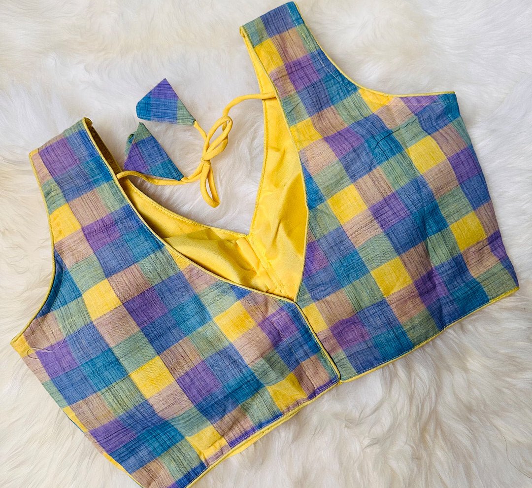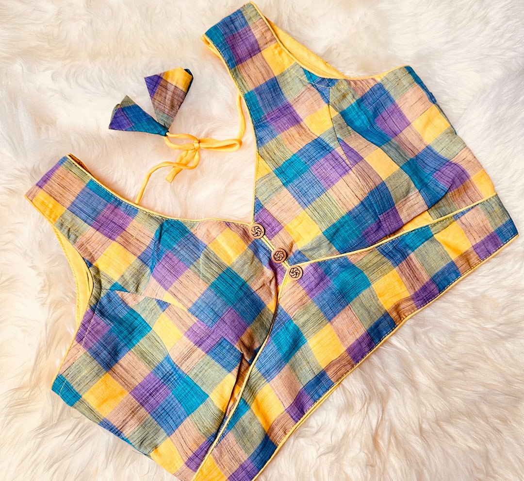 The Lemon Yellow and Blue Pure Ikkat Cotton Blouse with Intricate Geometric Pattern is refreshingly chic and perfect for any casual or formal occasion. The high-quality pure ikkat cotton material is soft, comfortable, and durable. The intricate geometric pattern in shades of lemon yellow and blue adds a touch of elegance and sophistication to the blouse. The unique and chic design is sure to make a statement and add a touch of charm to any outfit.