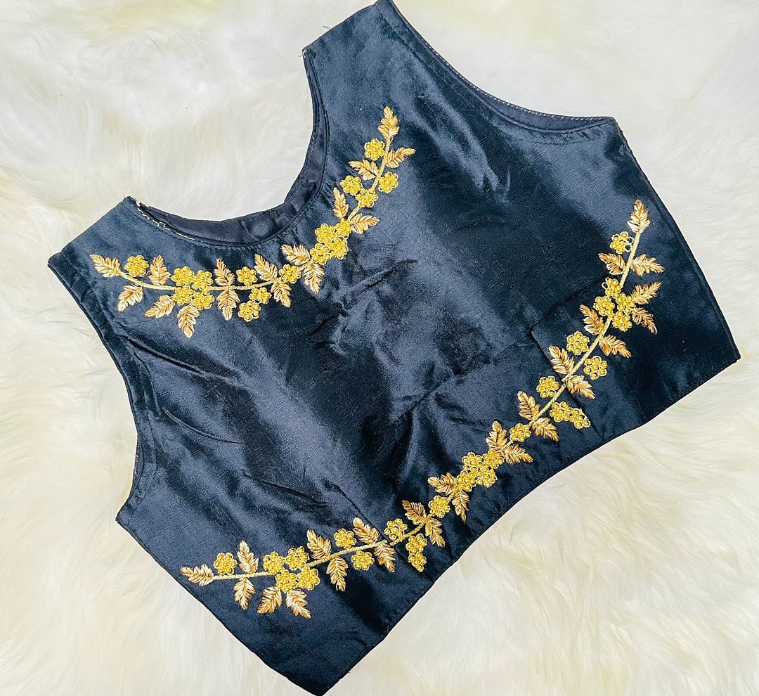 The Black Raw Silk Blouse with Golden Zardosi Work is a stunning piece that exudes regal elegance and radiance. Crafted from high-quality raw silk, this black blouse has a rich and luxurious texture that drapes beautifully over the body.