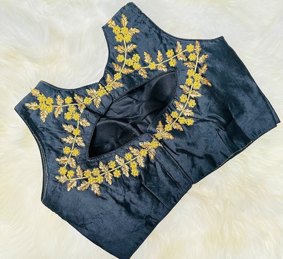 The intricate golden zardosi work adds a touch of radiance and sophistication to the blouse, creating a beautiful contrast against the black fabric.