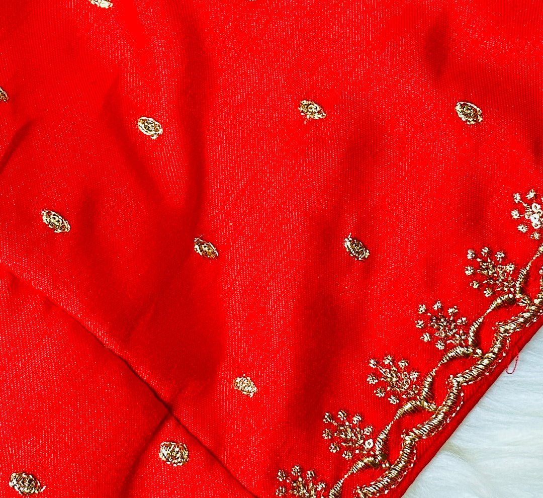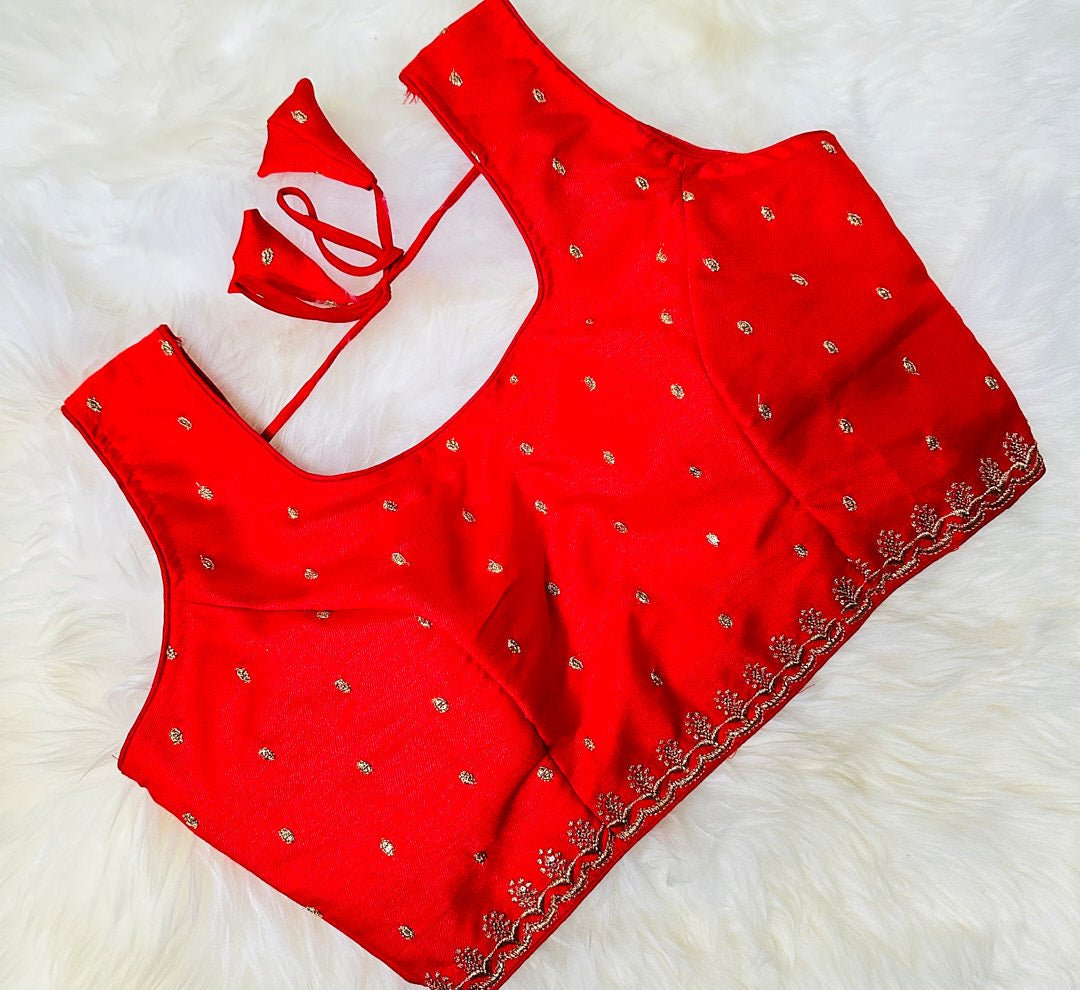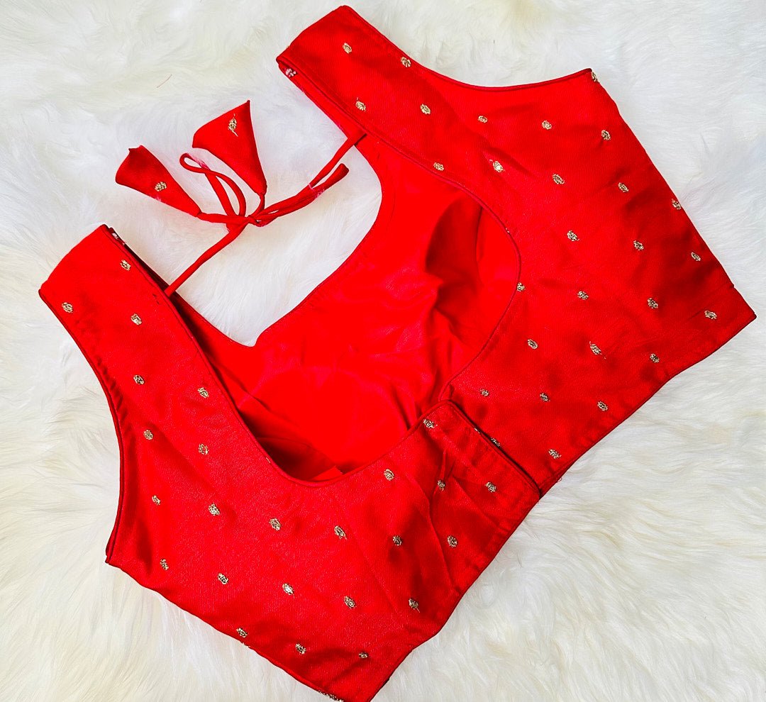 This stunning red raw silk Jaipuri blouse is a true masterpiece that exudes elegance and sophistication. The intricate golden buttis add a touch of opulence to its already beautiful design. The Jaipuri design adds a touch of traditional charm, making it a perfect choice for any occasion where you want to embrace your cultural roots and feel confident and beautiful. The blouse is crafted from high-quality raw silk fabric, known for its rich texture and luxurious feel. The flattering fit and impeccable attention to detail in the blouse's craftsmanship further enhance its elegance and regal look. So, exude royalty and elevate your ethnic style with this beautiful red raw silk Jaipuri blouse adorned with golden buttis.