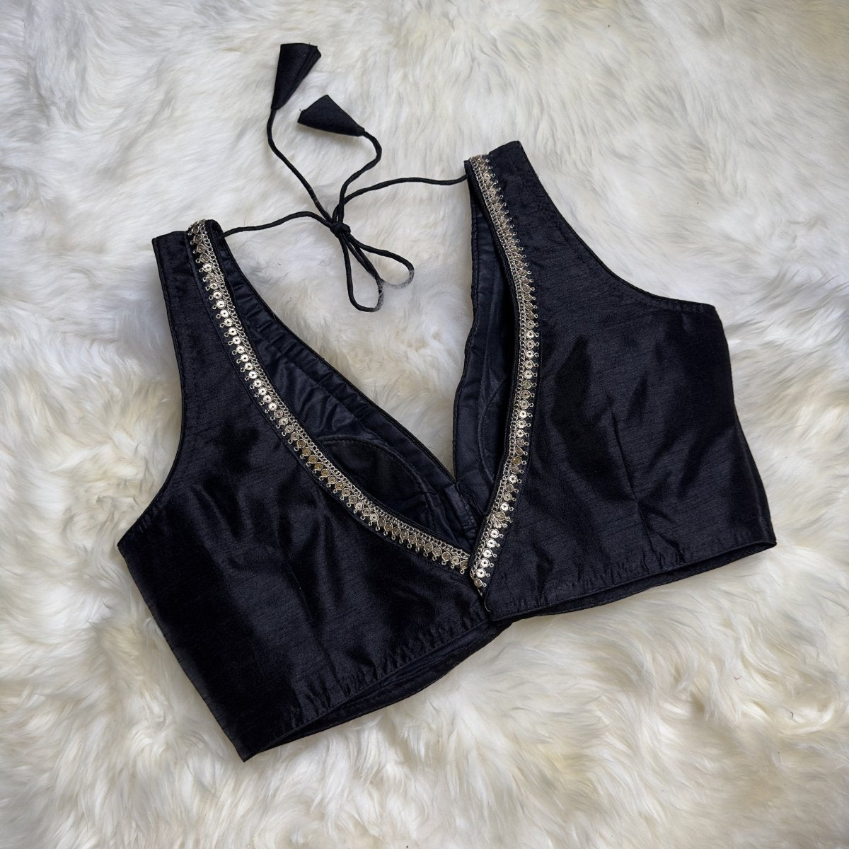 Elevate your traditional wardrobe with this Sophisticated Black Silk Blouse featuring sparkling sequin accents along the neckline. This blouse brings a perfect blend of classic elegance and modern glam, with a rich black color that exudes timeless charm. Crafted from premium silk, it provides a luxurious feel while maintaining a flawless fit, making it ideal for weddings, parties, or festive events. The sequin embellishments add just the right amount of dazzle, ensuring you stand out with effortless sophistication when paired with sarees or lehengas.