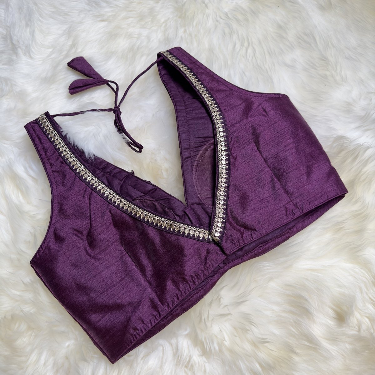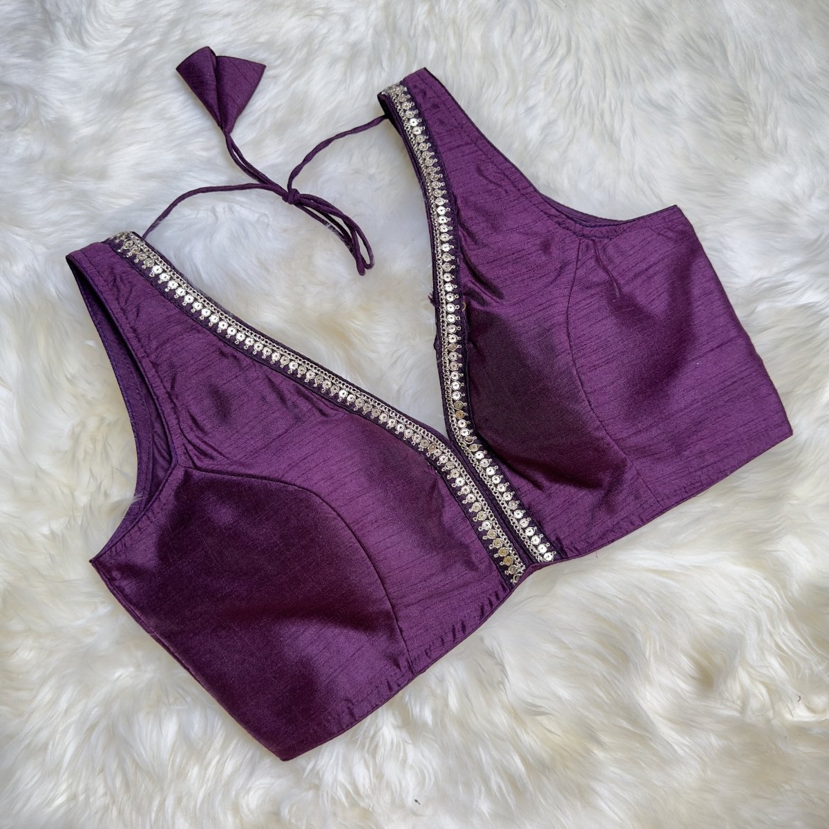 Embrace an aura of regal charm with our Stunning Plum Silk Blouse. Crafted from luxurious silk, this blouse features a beautiful deep plum hue adorned with an elegant sequined border, adding just the right amount of sparkle to your outfit. The sleek, sleeveless design makes it ideal for pairing with sarees and lehengas for weddings, festive celebrations, and glamorous parties. The tailored fit enhances your silhouette, making this blouse the perfect combination of sophisticated and stylish.
