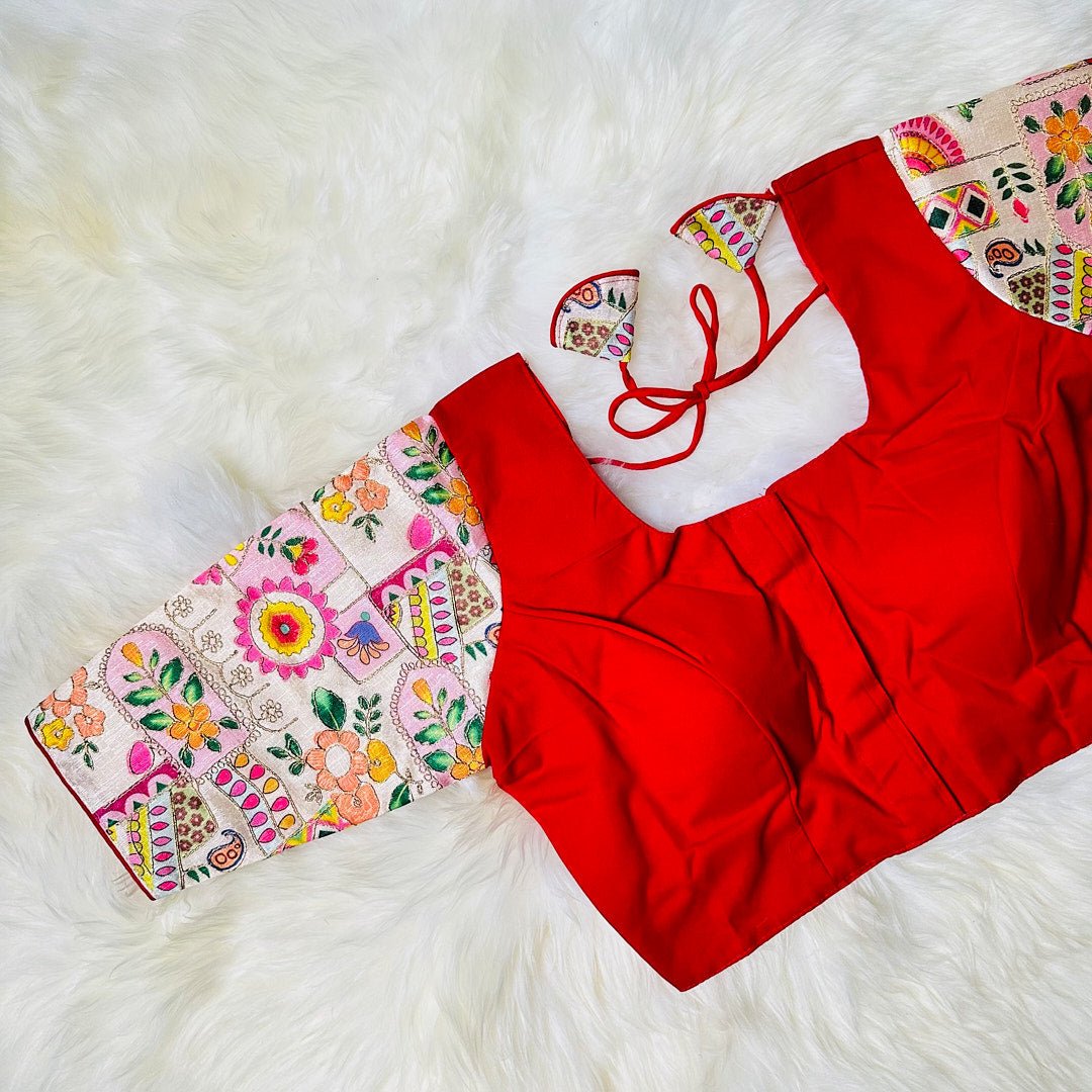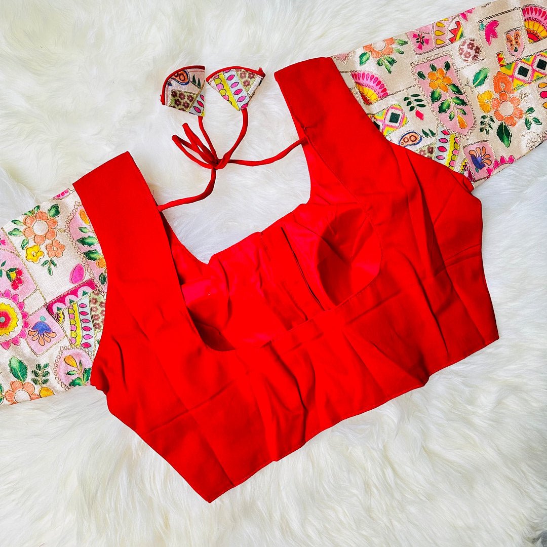 This striking blouse features a bold and passionate red hue that radiates confidence and style. Its contrasting sleeves add a playful and modern twist, showcasing a beautiful design that effortlessly blends contemporary fashion with timeless elegance. This garment is sure to make a statement and leave a lasting impression, perfect for any occasion where you want to showcase your bold and unique personality with elegance and grace.