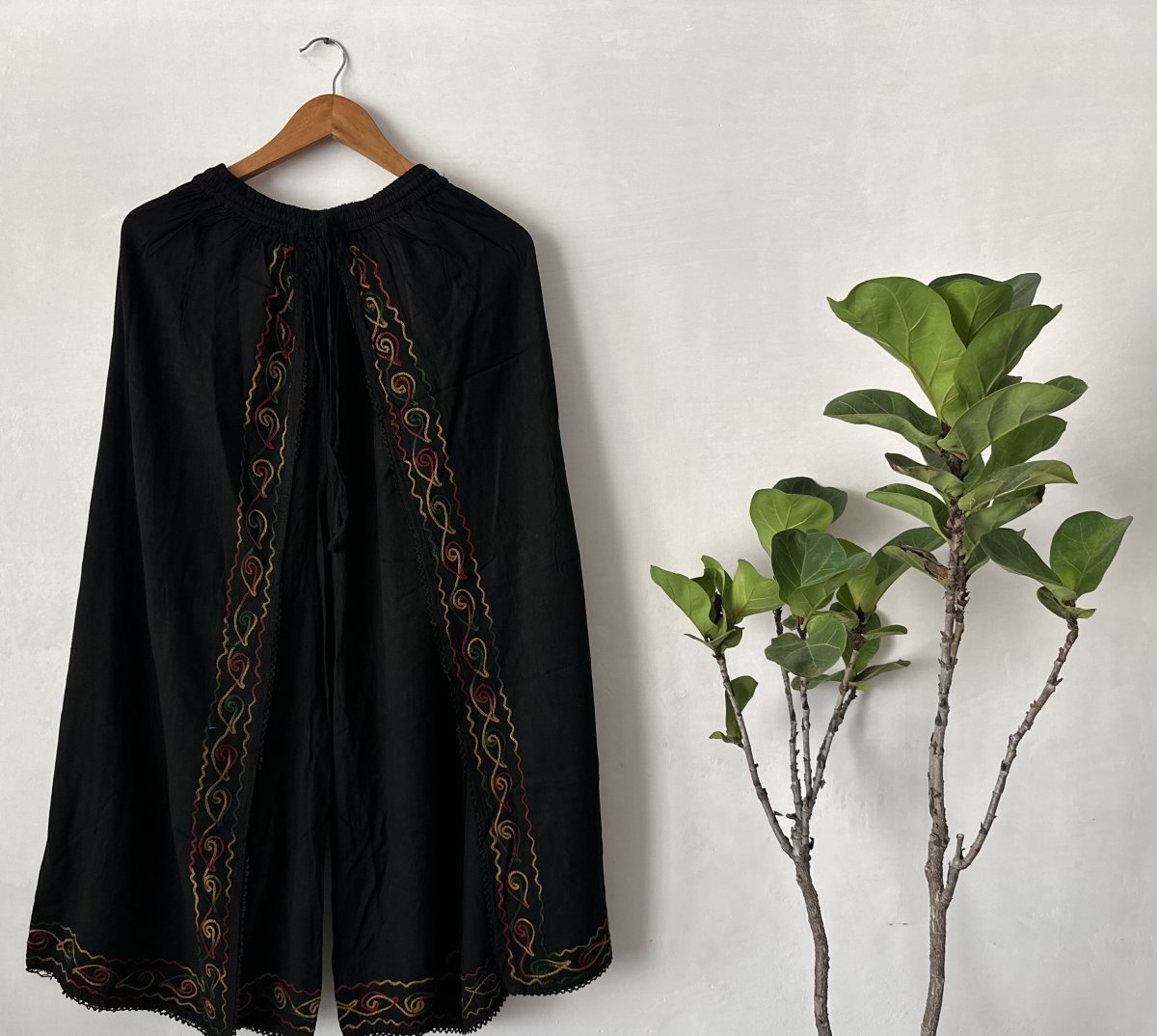 Elevate your style with our Embroidered Black Wide-Leg Pants, crafted from soft, breathable Viscose Rayon for ultimate comfort. These elegant pants showcase exquisite, colorful embroidery along the front and hem, beautifully contrasting the deep black fabric and adding an artisanal flair. The wide-leg silhouette and comfortable elastic waistband make these pants perfect for versatile styling, whether for casual outings or a chic evening look. Designed for the eco-conscious fashionista, these pants combine traditional craftsmanship with modern elegance. Add a timeless and unique piece to your collection with these beautifully embroidered black pants that embody sustainability and style.