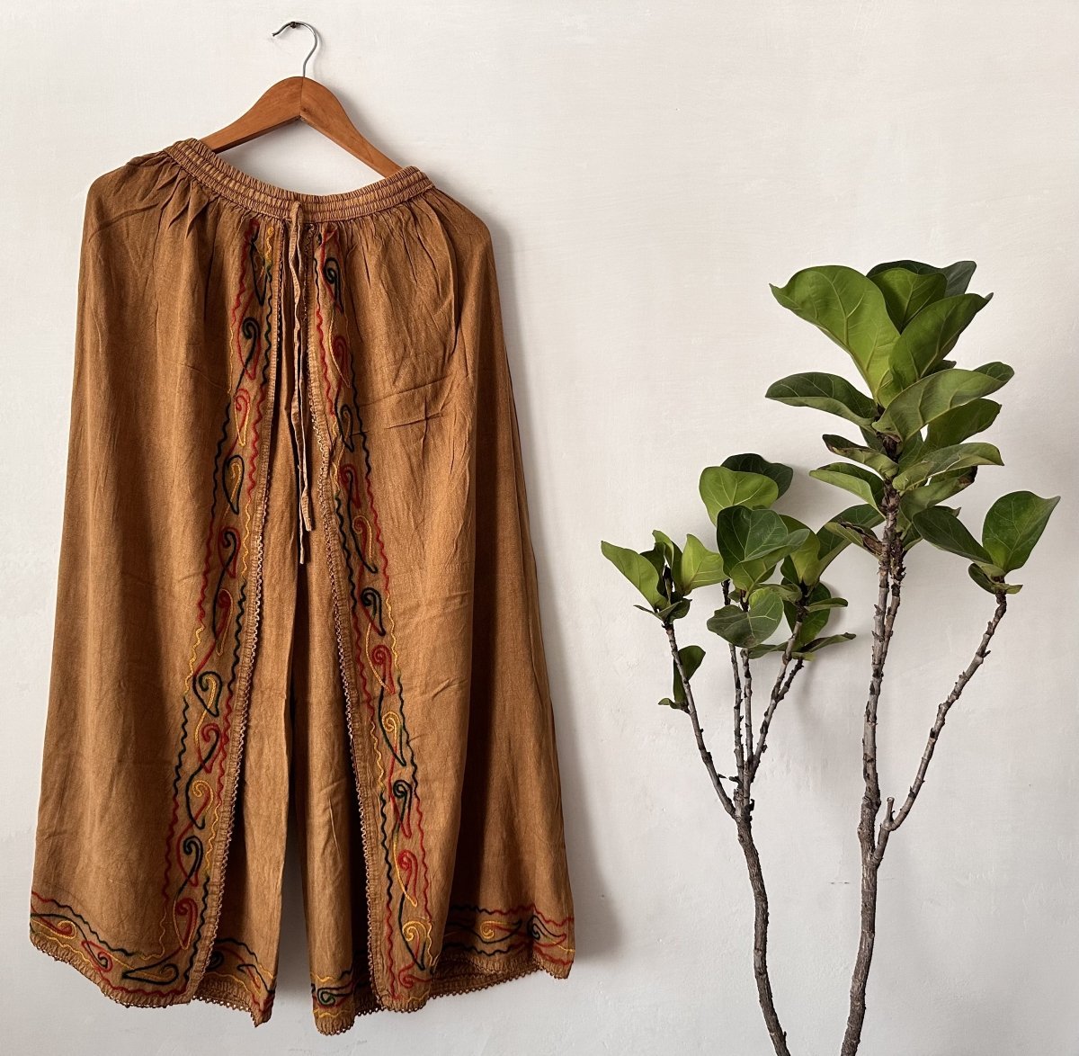 Add a warm, earthy touch to your wardrobe with our Embroidered Brown Wide-Leg Pants, crafted from soft, high-quality Viscose Rayon for all-day comfort. These wide-leg pants feature beautiful, colorful embroidery along the front and hem, adding a vibrant contrast to the rich brown fabric. Designed with a relaxed fit and elastic waistband, these pants provide both style and ease, perfect for any occasion, from casual outings to festive gatherings. Celebrate sustainable fashion with a piece that blends traditional artistry and modern comfort, ideal for the fashion-forward woman who values unique, eco-friendly style. Make a statement with these one-of-a-kind embroidered pants that bring elegance and authenticity to your collection.