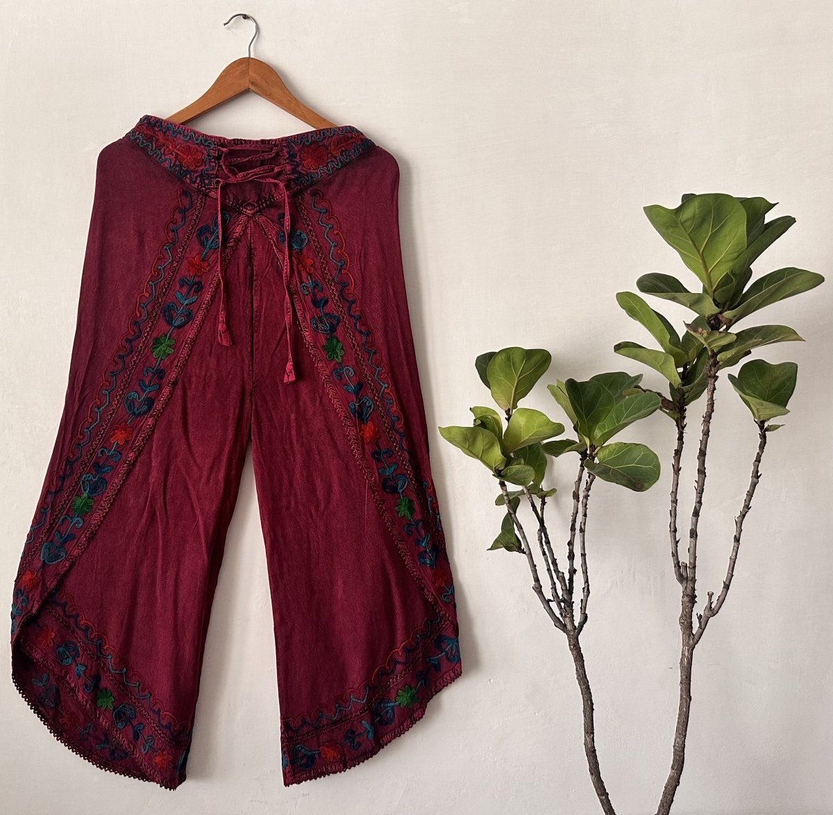 Infuse vibrant charm into your wardrobe with our Embroidered Deep Pink Wrap Palazzo Pants, crafted from premium Viscose Rayon for all-day comfort. These stylish pants feature intricate floral embroidery in rich shades of green, blue, and red, beautifully accentuating the bold deep pink fabric. With an adjustable tie waist and wide-leg design, these palazzo pants offer a flattering and flowy fit, ideal for both casual and dressier occasions. Perfect for those who value artistic craftsmanship and modern style, these unique pants blend tradition with contemporary flair. Stand out with these embroidered palazzo pants that bring a lively touch of elegance and individuality to any outfit.