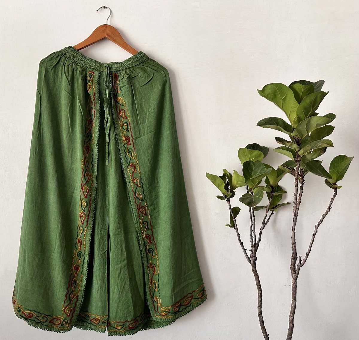 Refresh your wardrobe with our Embroidered Green Wide-Leg Pants, crafted from soft, breathable Viscose Rayon for a relaxed and airy fit. These elegant palazzo-style pants showcase intricate embroidery along the front and hem, adding an artisanal touch to the rich green fabric. With a comfortable elastic waistband and a flattering wide-leg silhouette, these pants are designed for all-day comfort and effortless style. Perfect for casual outings or styled up for a unique evening look, these eco-conscious pants blend traditional craftsmanship with modern elegance. Step into sustainable fashion with a piece that’s as stylish as it is unique.