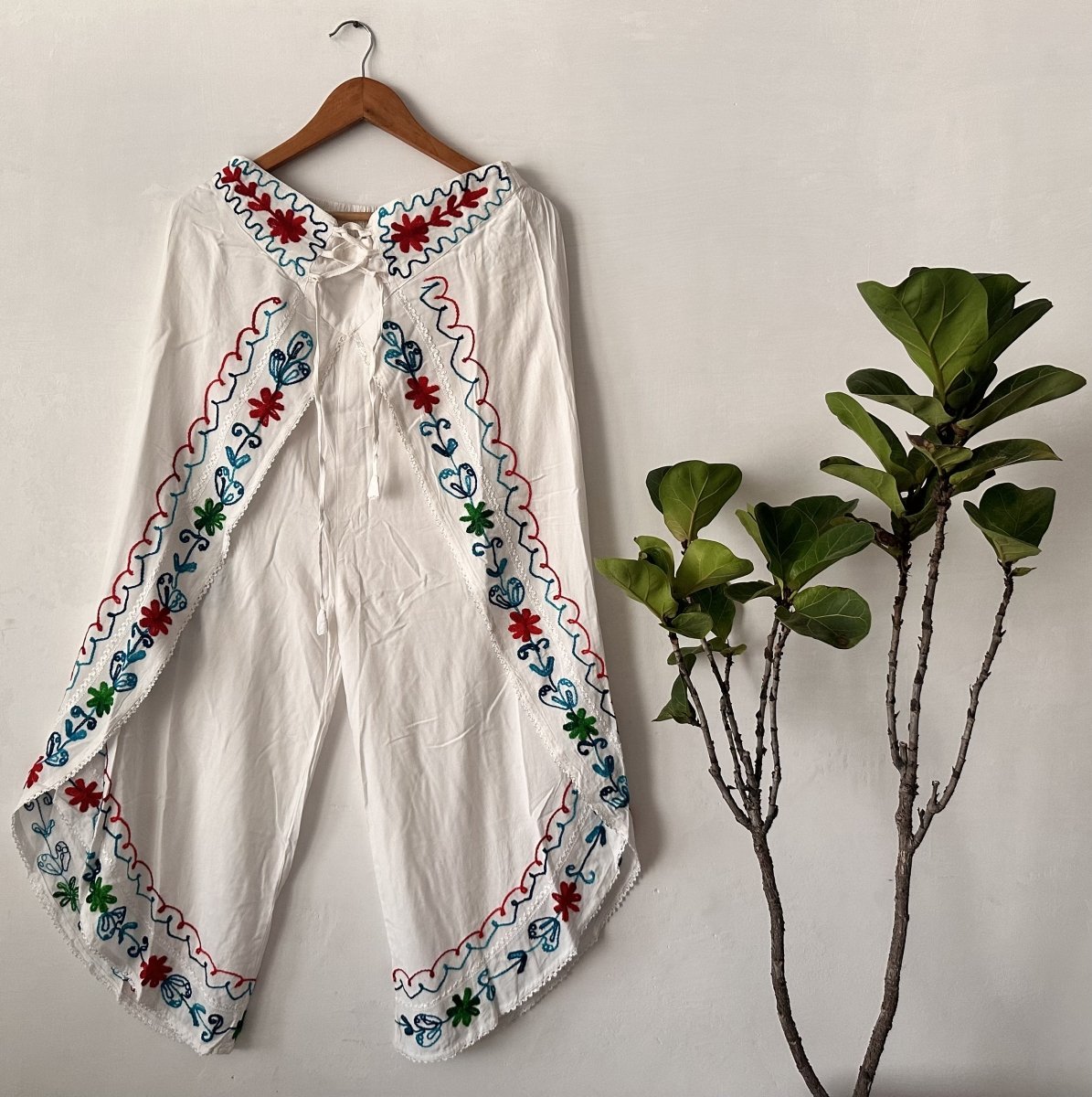 Brighten your wardrobe with our Floral Embroidered White Palazzo Pants, crafted from soft, breathable Viscose Rayon for a lightweight feel. These unique wrap-style palazzo pants are adorned with vibrant floral embroidery in red, green, and blue, adding a pop of color against the crisp white fabric. The wrap-around design enhances the wide-leg silhouette, creating a graceful, flowy look that’s both stylish and comfortable. Featuring an adjustable tie waist for a custom fit, these pants are perfect for casual days or relaxed gatherings. Ideal for those who appreciate eco-conscious, artisanal fashion, these palazzo pants bring traditional craftsmanship to modern styling. Elevate your outfit with a touch of elegance and sustainable charm with these beautiful embroidered pants.