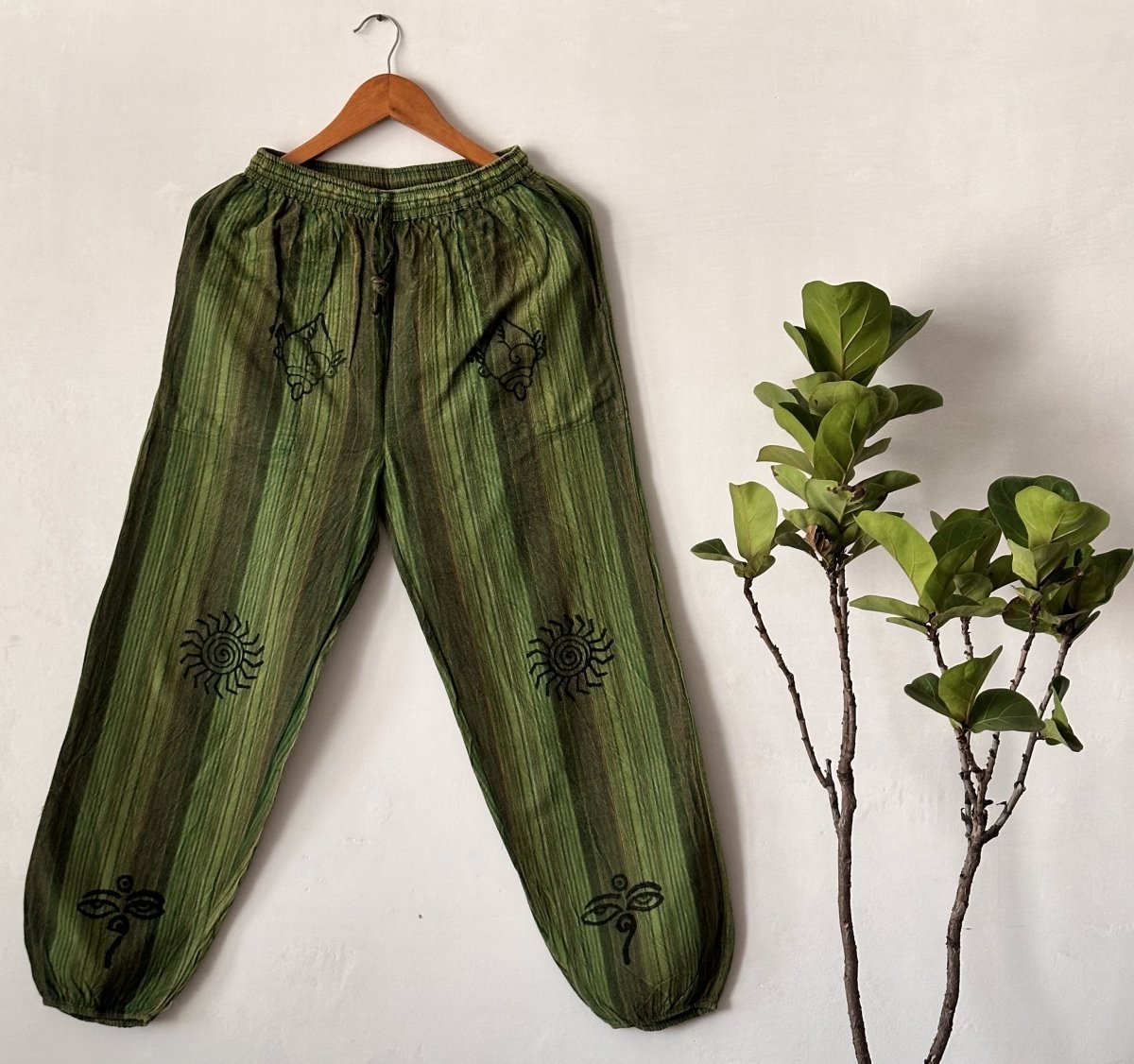 Earthy Green Balloon Fit Cotton Pants | Naturally Hand-Dyed with Tribal-Inspired Prints