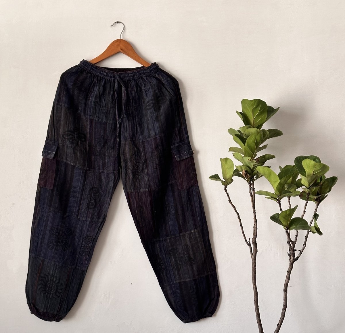 Midnight Patchwork Cotton Balloon Pants | Naturally Dyed with Subtle Artistic Patterns