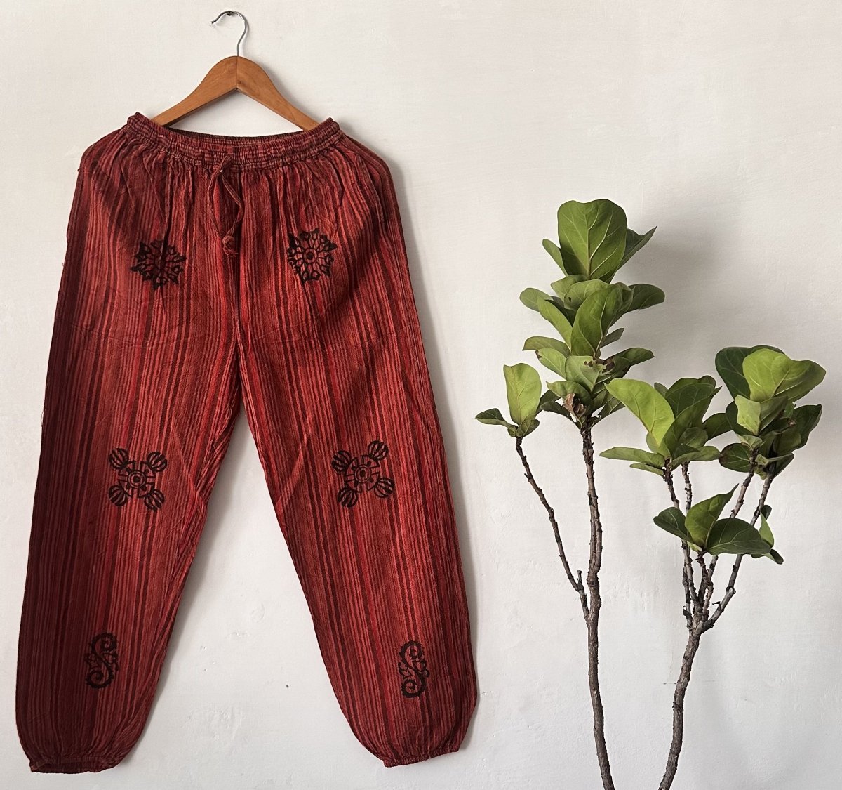 Enhance your wardrobe with our Rust Red Balloon Fit Cotton Pants, expertly crafted from premium cotton and hand-dyed with natural dyes for an eco-friendly and sustainable choice. These relaxed-fit pants feature a stylish balloon silhouette, complete with an elastic waistband and gathered ankle cuffs for all-day comfort. The deep rust red tone is beautifully complemented by unique printed patterns, adding an artistic flair to these versatile cotton pants. Perfect for casual outings, travel, or relaxing at home, these pants blend traditional dyeing techniques with modern style. Embrace the earthy elegance of natural fabrics and make a conscious fashion statement with these hand-dyed, balloon fit cotton pants.
