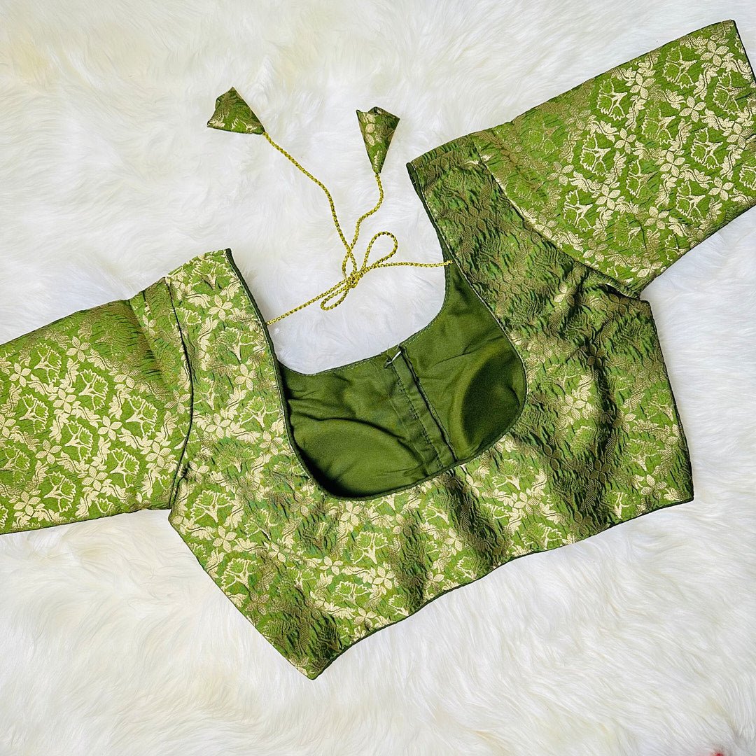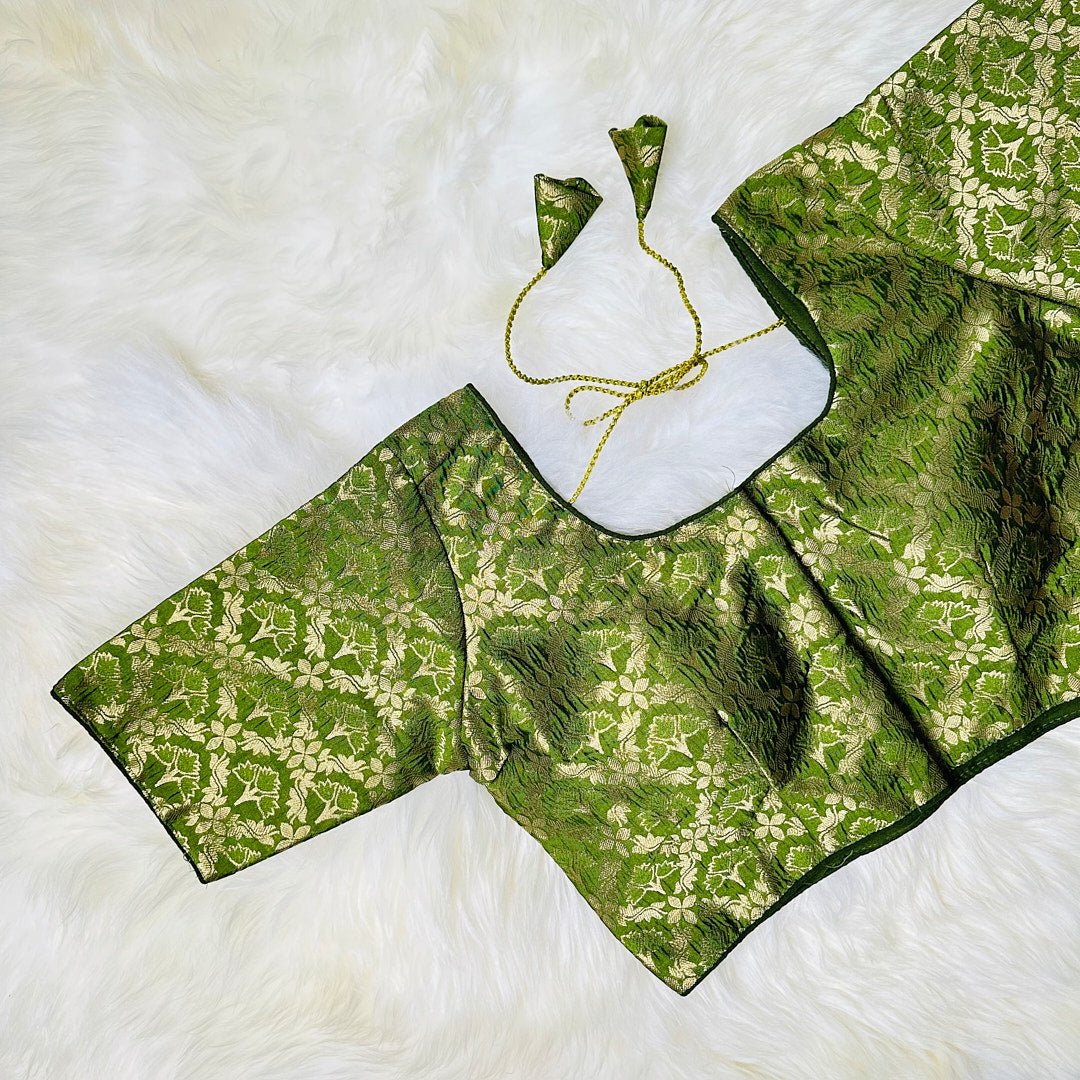 Elevate your ethnic wear with this exquisite olive green brocade blouse, embellished with intricate golden floral patterns. The rich fabric and delicate detailing create a look that exudes glamour and sophistication, perfect for any festive occasion. The golden floral patterns catch the light and create a mesmerizing effect, making this blouse a true showstopper. The unique olive green color adds a touch of modernity, making it a perfect addition to your wardrobe. The blouse is tailored to perfection to fit you snugly and provide maximum comfort.