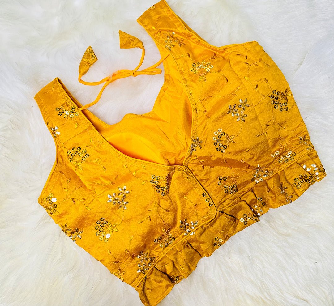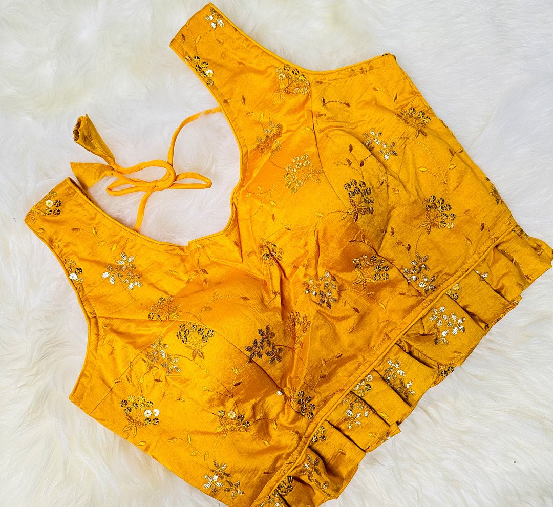 This raw silk yellow frilled blouse is a stunning masterpiece that exudes effortless elegance and radiates a vibrant glow. The foil sisha work adds a touch of opulence to its already beautiful design. The intricate frills and vibrant yellow color make it a perfect choice for any occasion where you want to look and feel your best. The raw silk fabric is known for its lustrous texture and luxurious feel, adding to the blouse's overall appeal. The impeccable attention to detail in the blouse's craftsmanship further enhances its beauty and sophistication. So, bask in the radiant glow of this raw silk yellow frilled blouse adorned with foil sisha work and elevate your style to new heights.