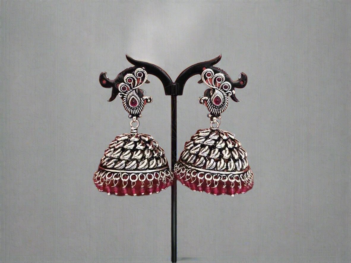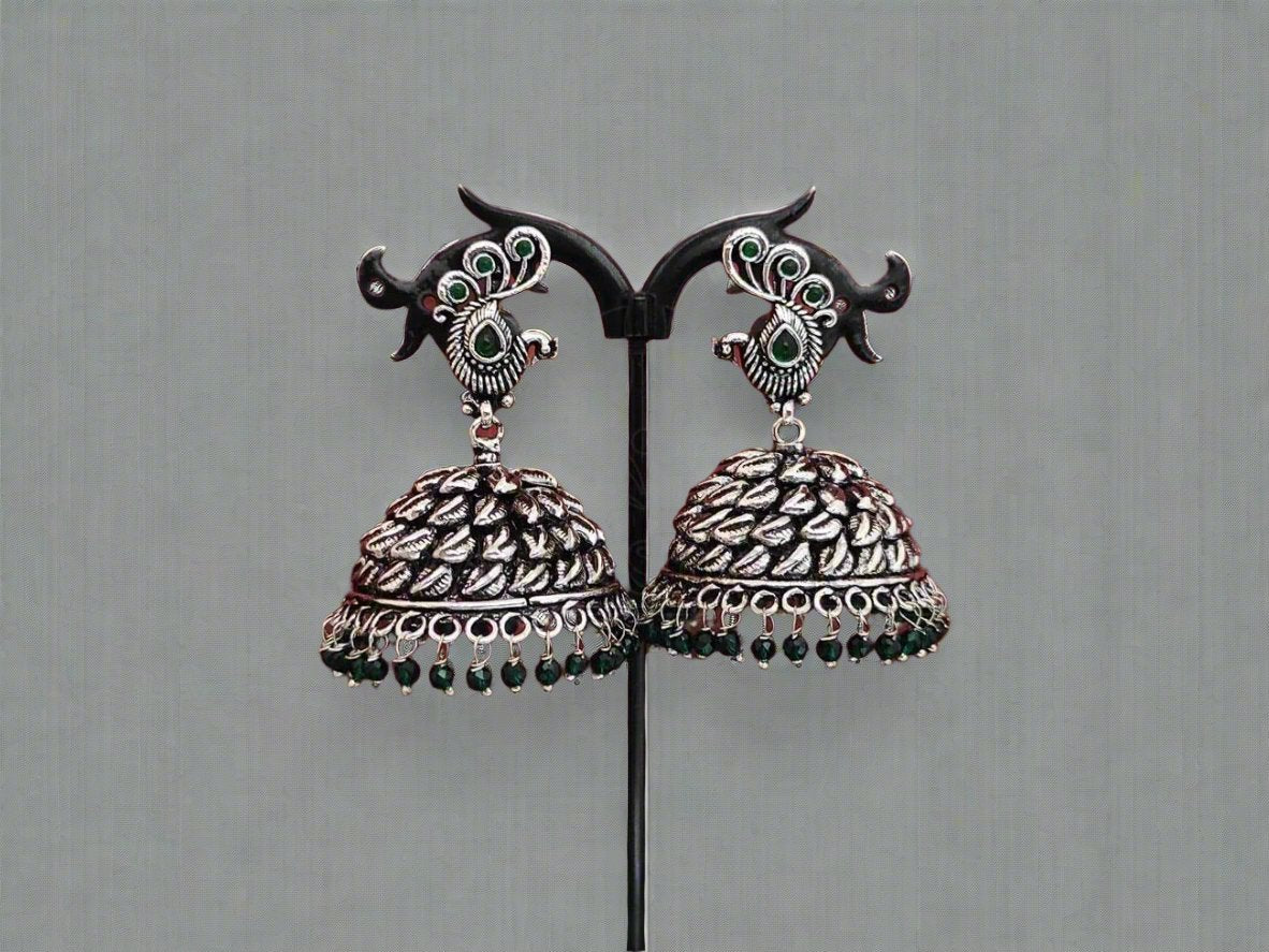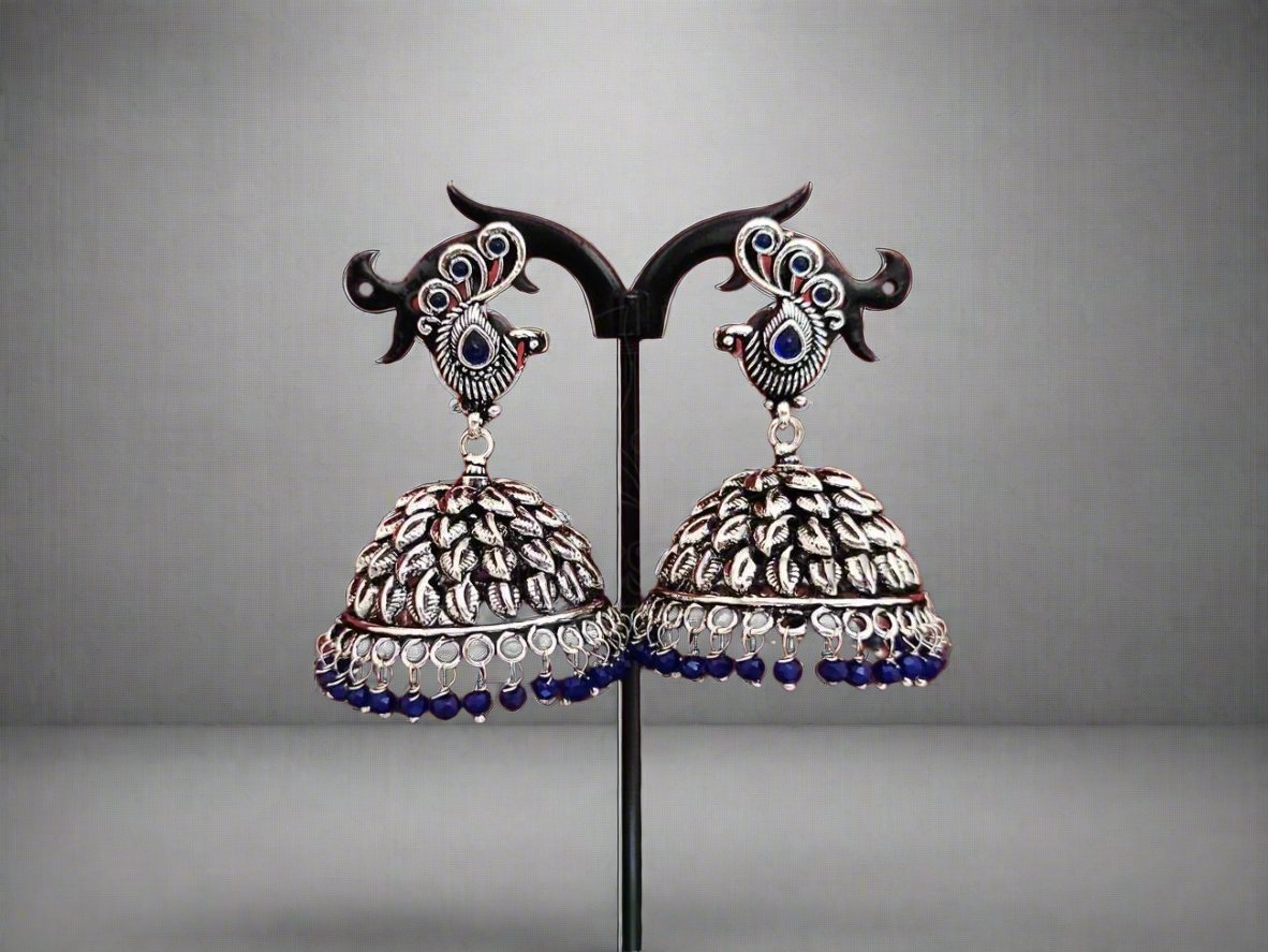 These earrings feature an oxidised silver finish with intricate beadwork, adding a touch of elegance to any outfit. The jhumka style design makes them perfect for traditional and festive occasions.