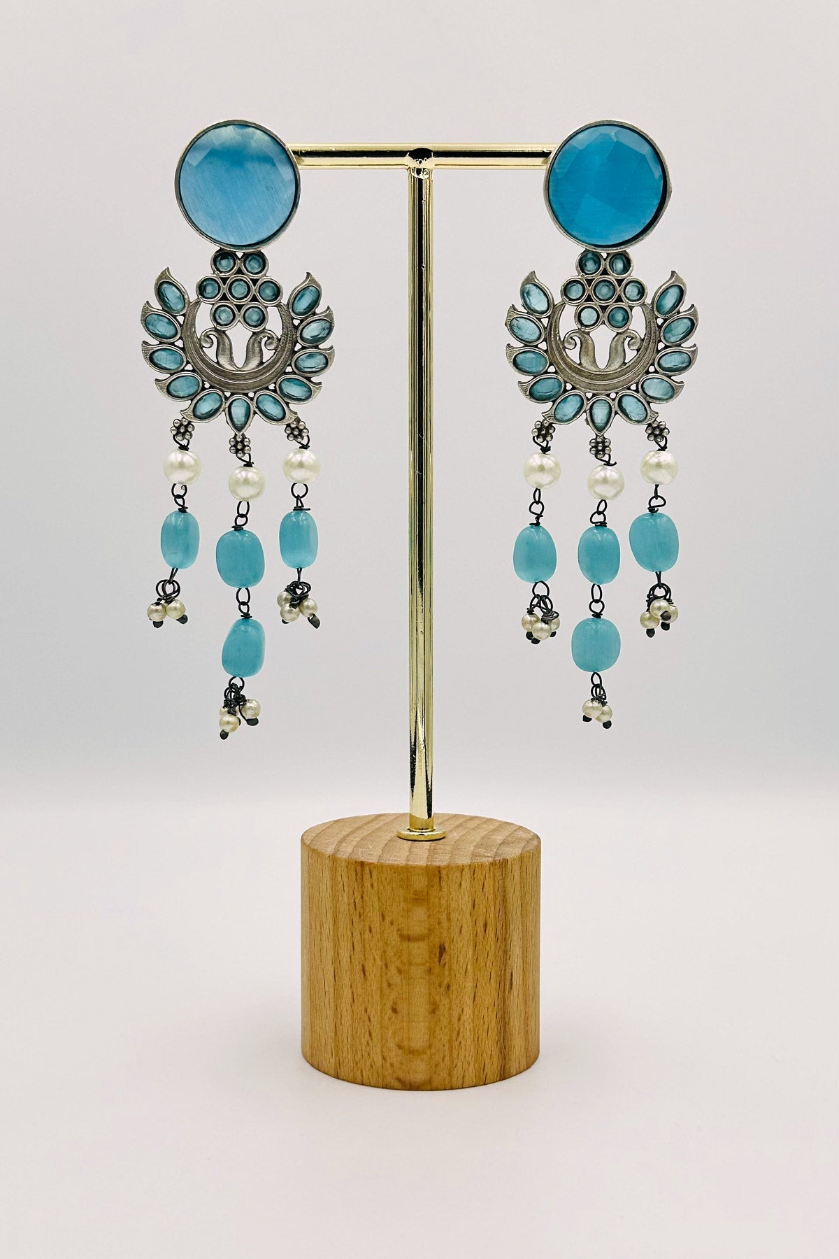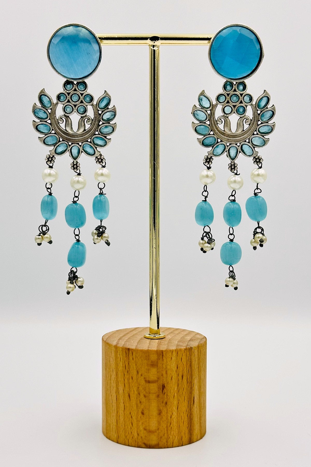 Blue Silver Dangler Earrings with Floral Detailing - swadeshsouq.com