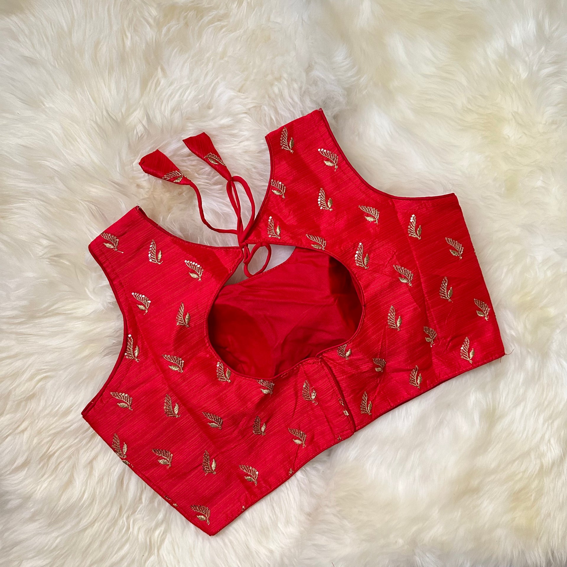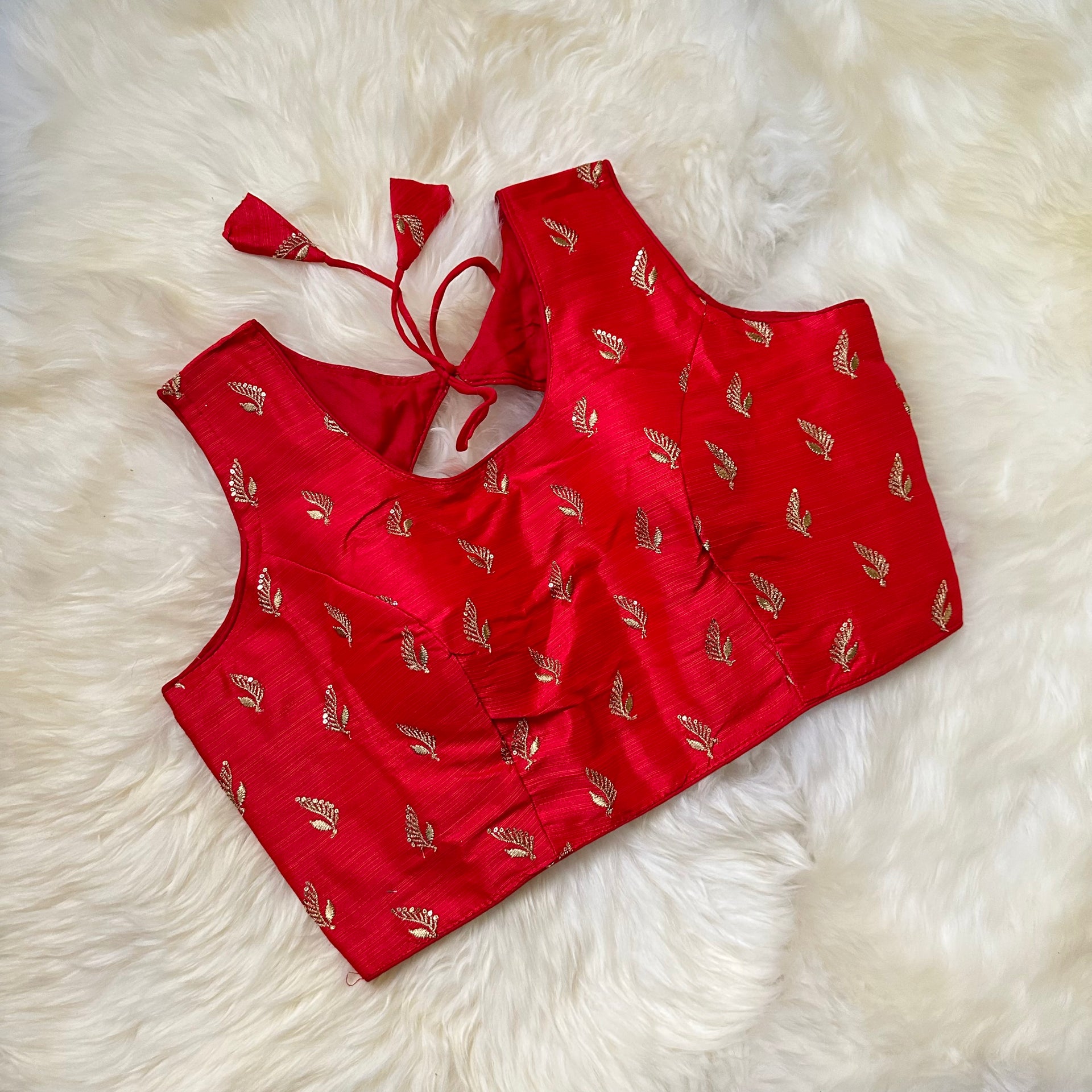 An eternal favorite, this red raw silk blouse with golden aari work radiates elegance and festive charm. Perfect for weddings, traditional celebrations, and parties, it enhances your saree with a royal and timeless appeal.