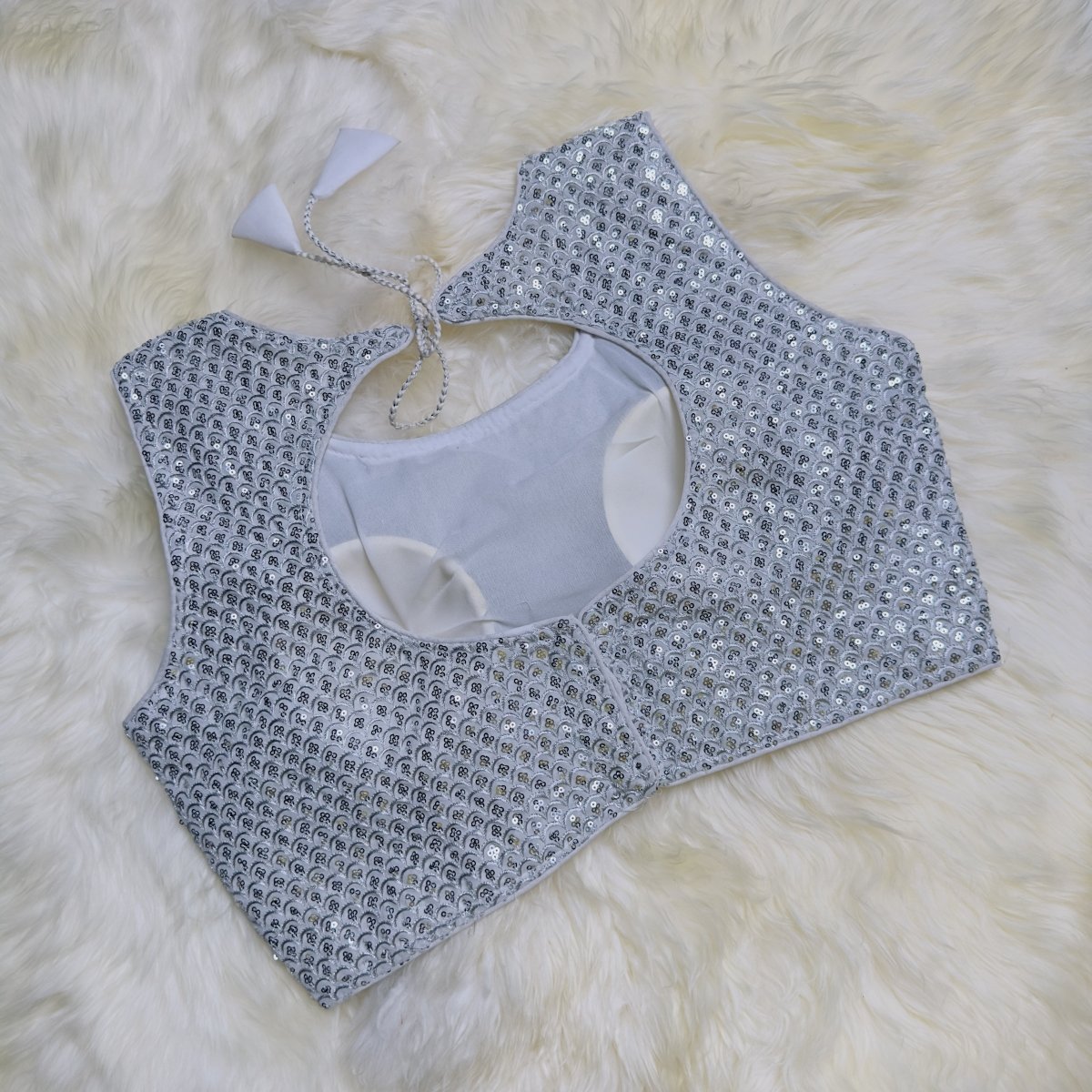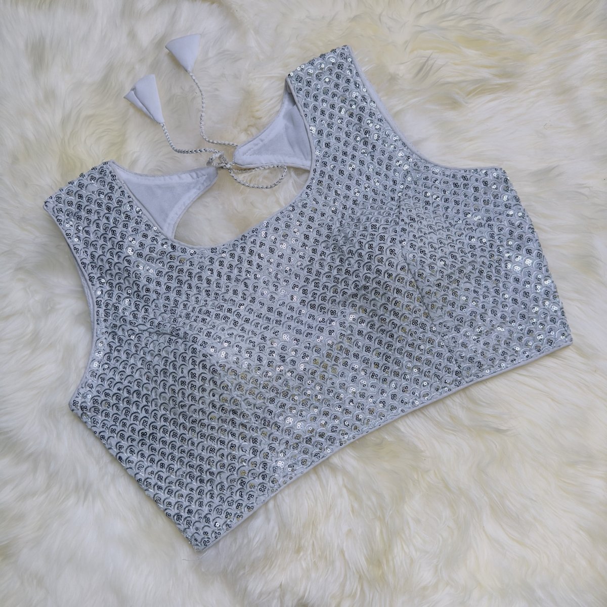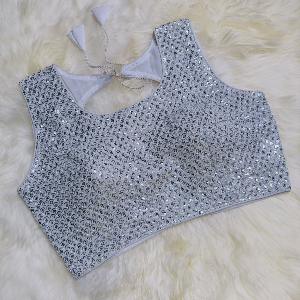 Sparkle with confidence in our Dazzling Silver Sequin Designer Blouse. This stunning blouse is crafted with intricate sequin work that adds a shimmering touch to any ethnic ensemble. The radiant silver color exudes elegance and modern sophistication, making it a perfect choice for weddings, receptions, and festive parties. Designed for a flattering fit, this blouse comfortably fits sizes 32 to 38, ensuring you look and feel your best. Pair it with a saree or lehenga to make a glamorous statement that turns heads effortlessly.