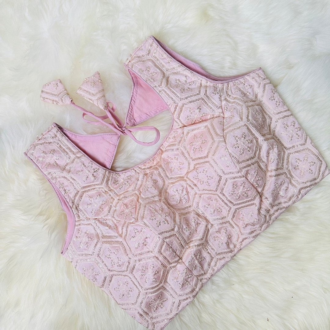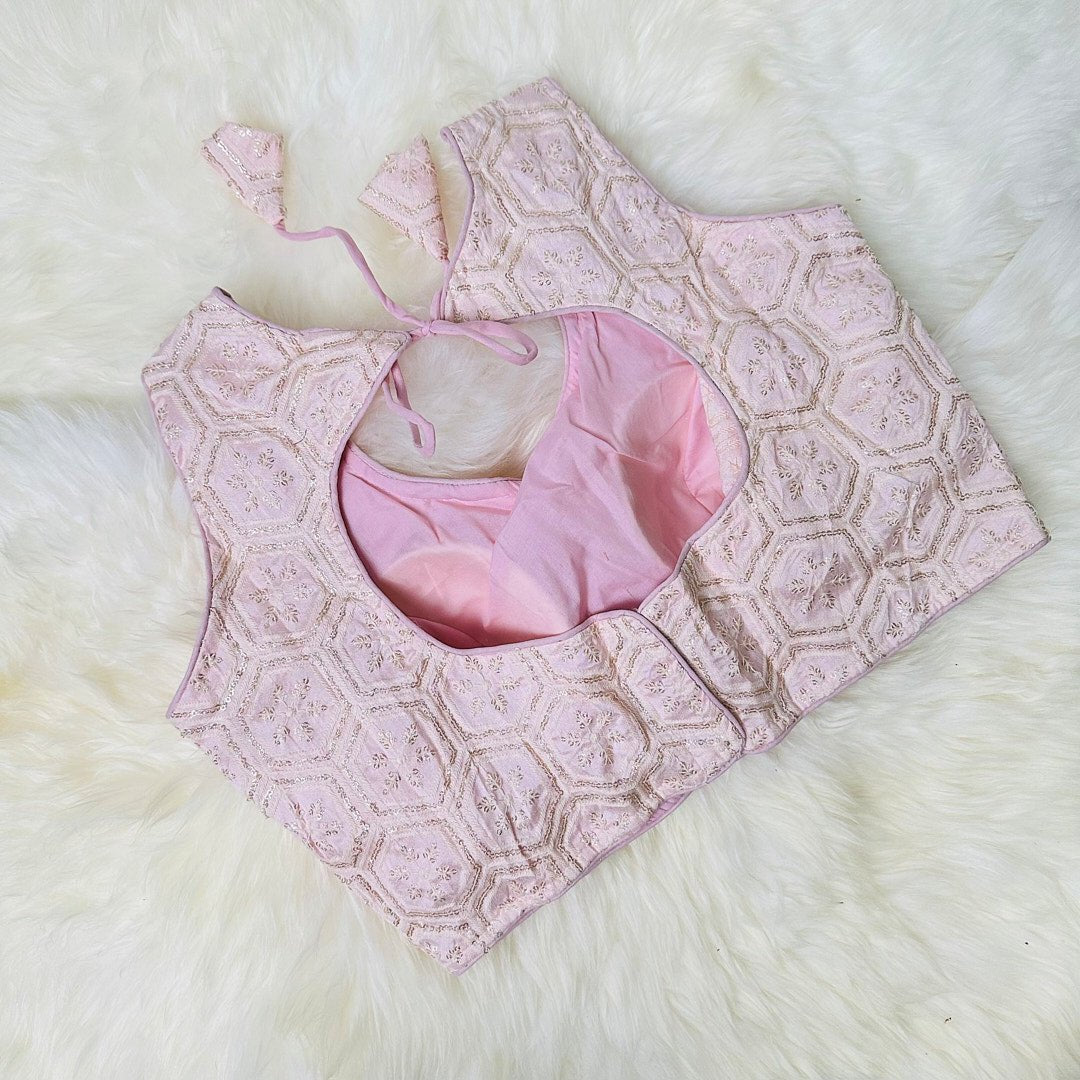 "Elegant Blush: Light Pink Raw Silk Blouse with Intricate Embroidery and Sequin Detailing. - swadeshsouq.com