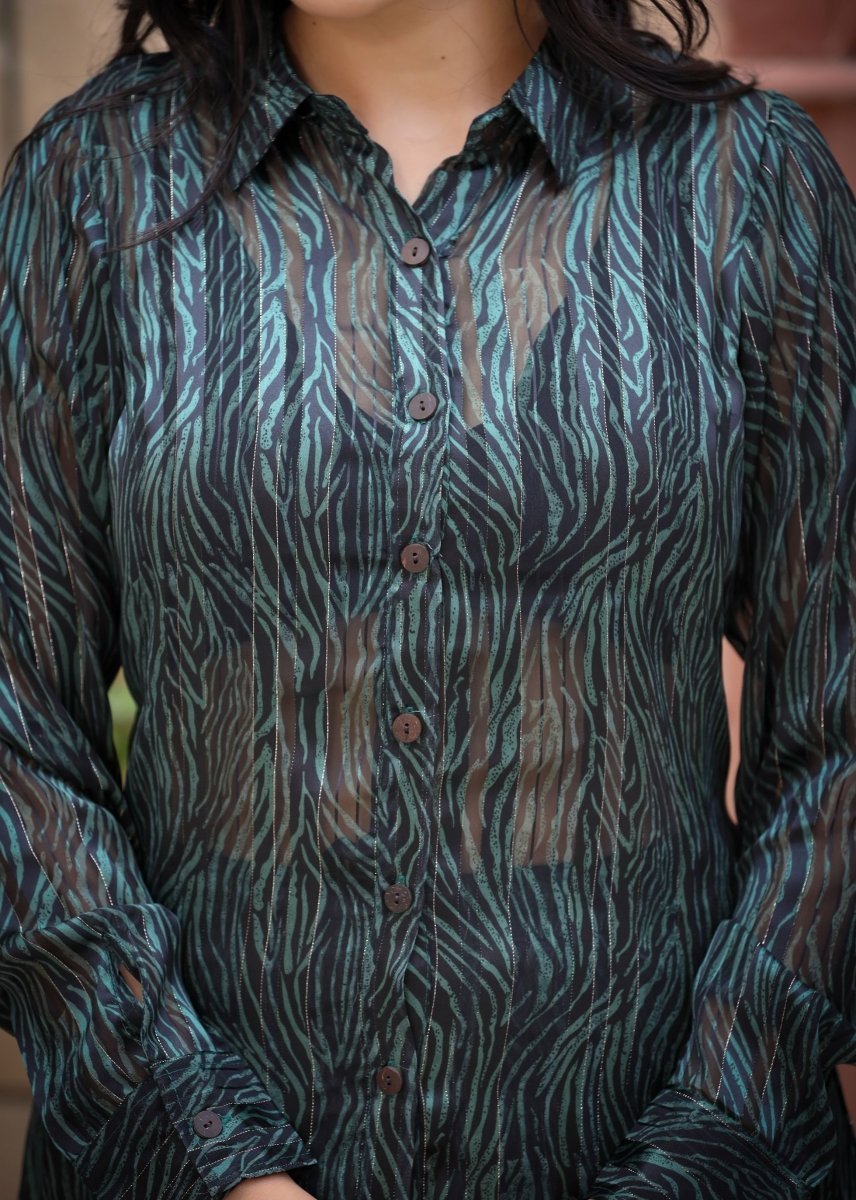 Green abstract printed shirt, has shirt collar, full sleeves, full placket button closure and regular waist hem