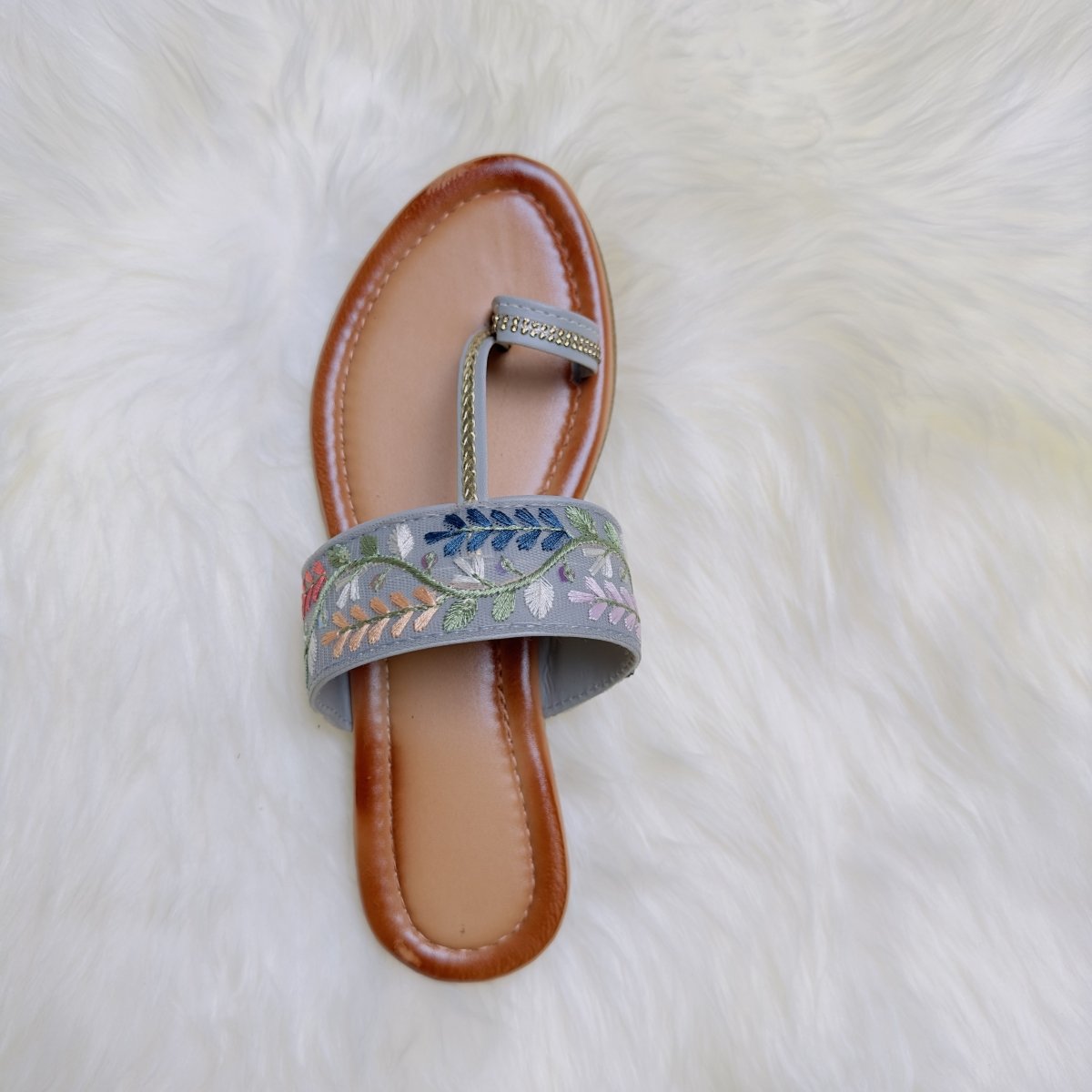Elegant Grey Hand-Embroidered Sandals – Subtle Floral Grace