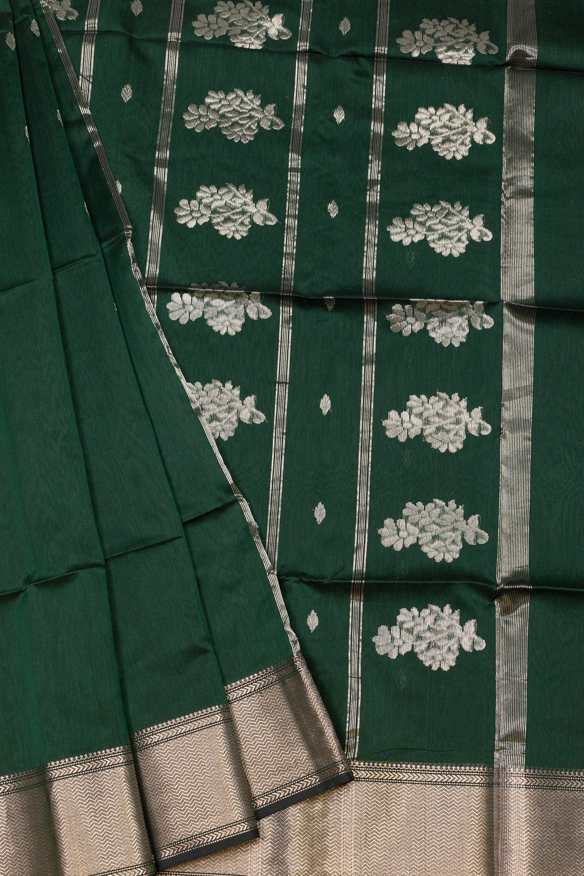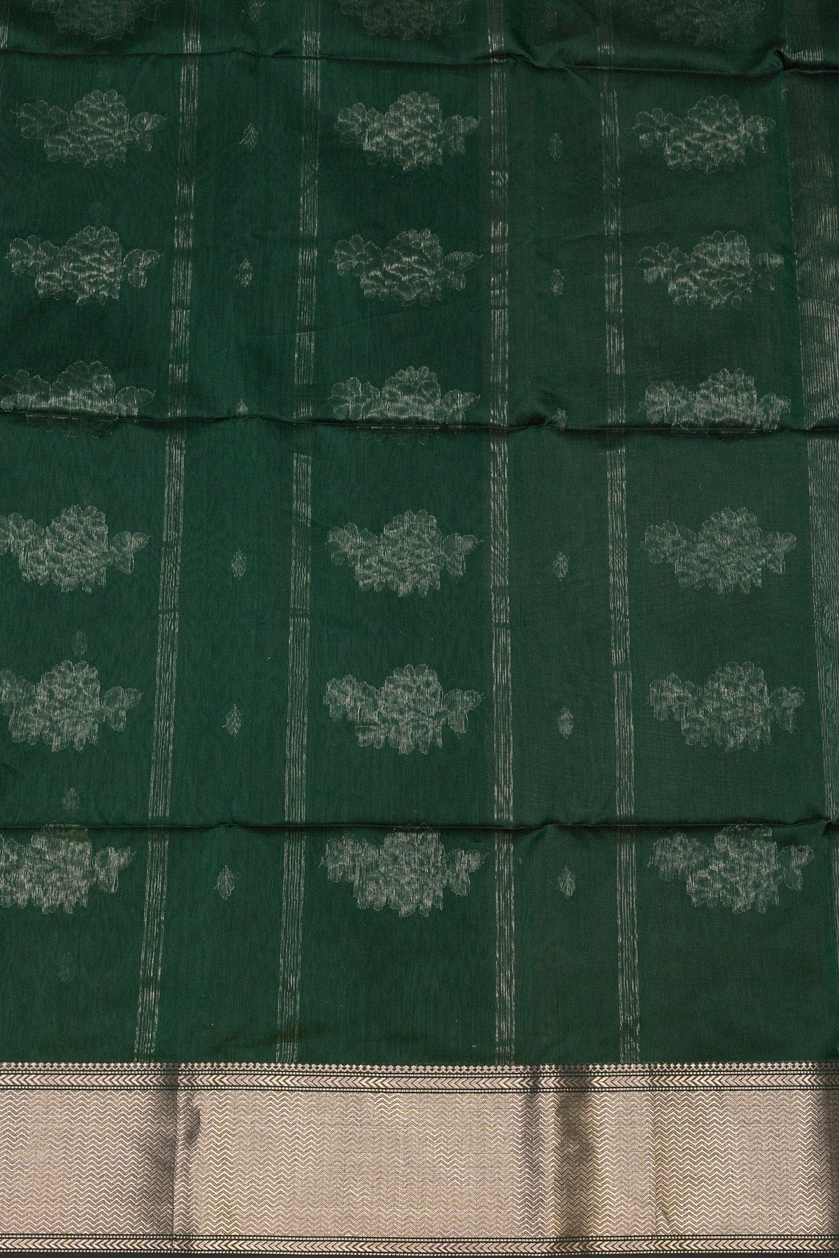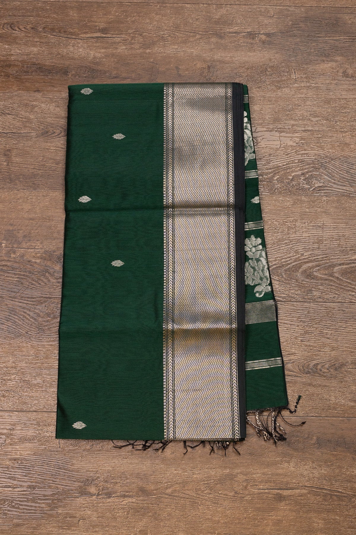 Drape in the rich allure of this emerald green Maheshwari cotton saree. Adorned with silver zari buttis and inspired by timeless traditions, it radiates a simple yet profound elegance. A touch of heritage for the modern woman.
