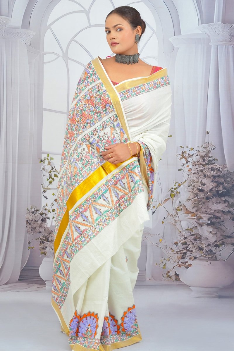 Eternal Grace – Madhubani Hand - Painted Kerala Cotton Saree - swadeshsouq.com