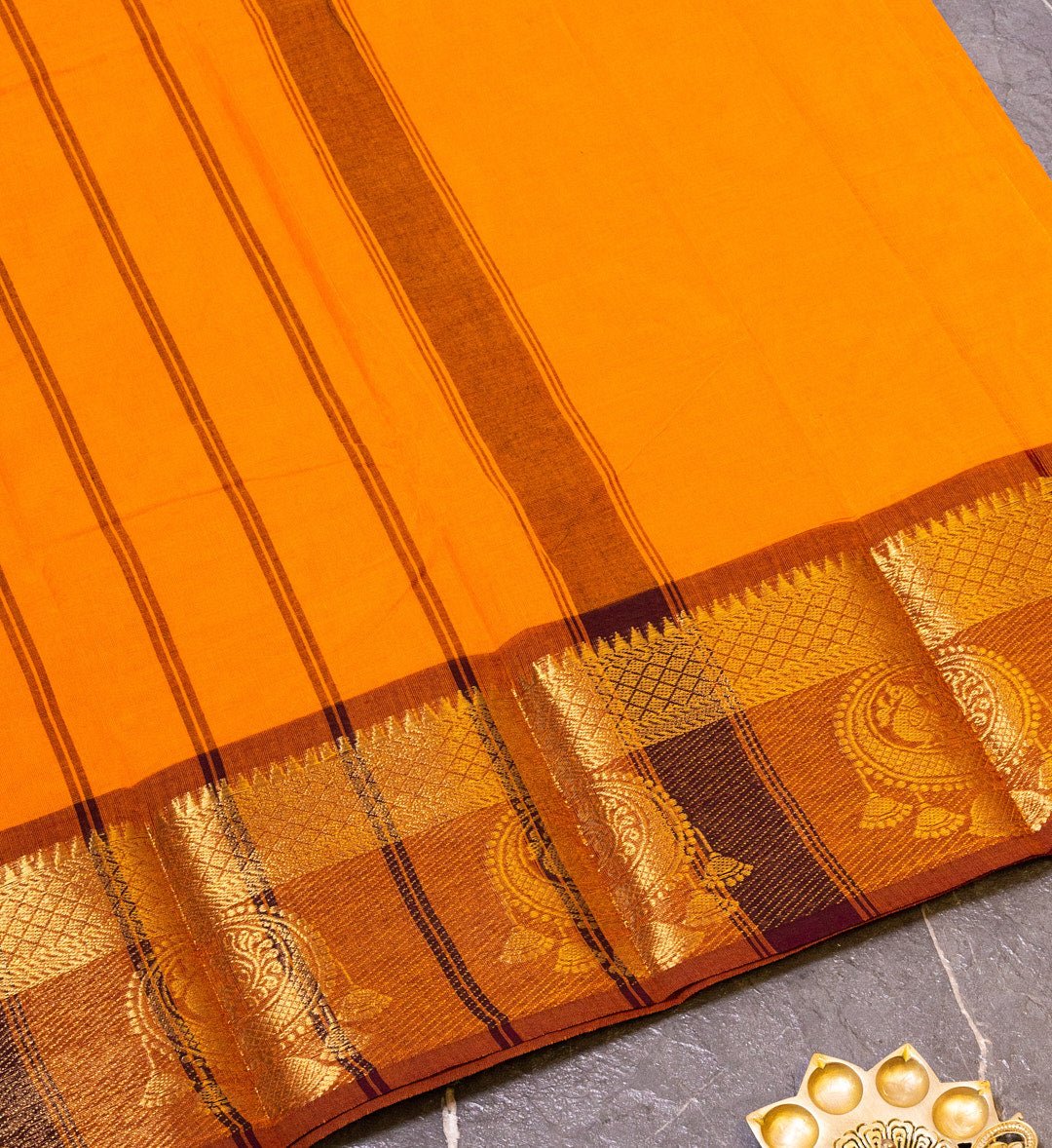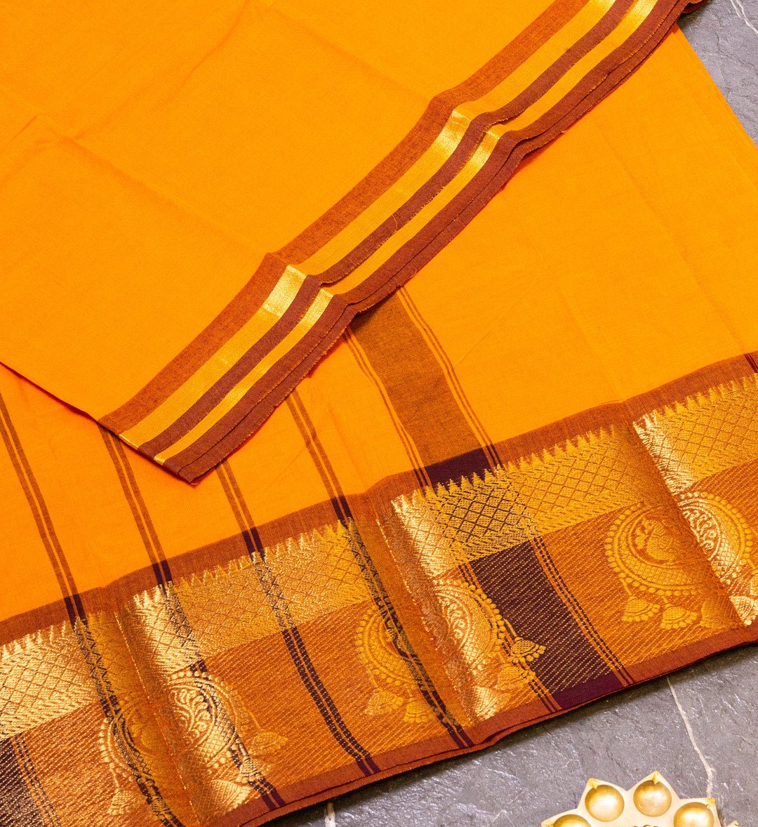 Yellow and Brown Pure Cotton Saree with Elegant Zari Borders