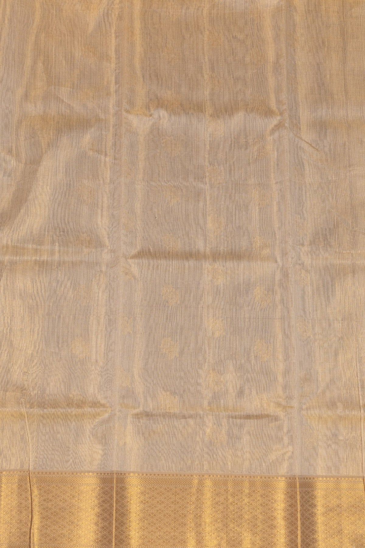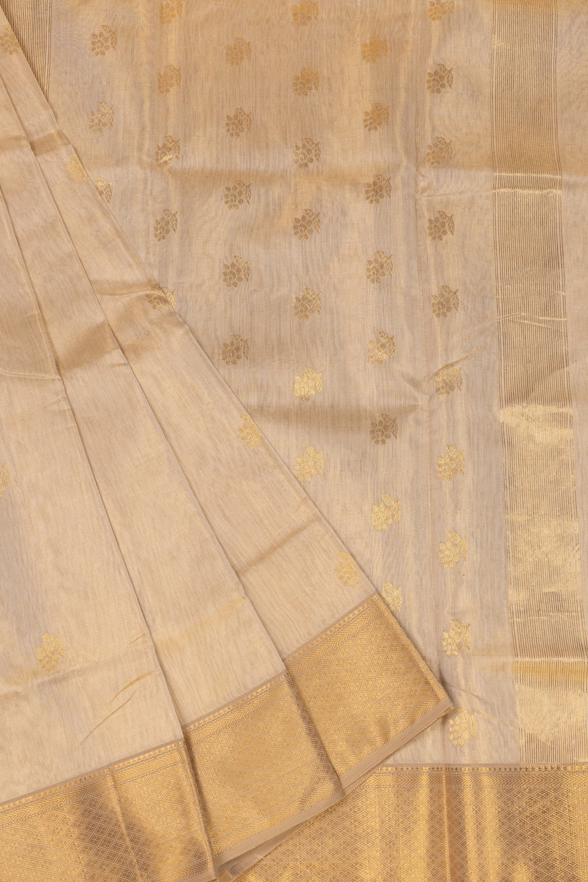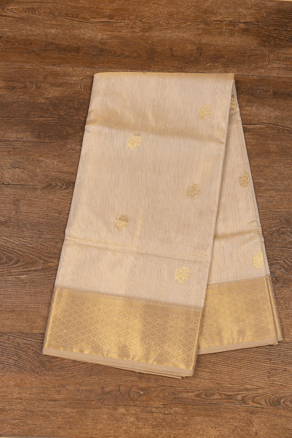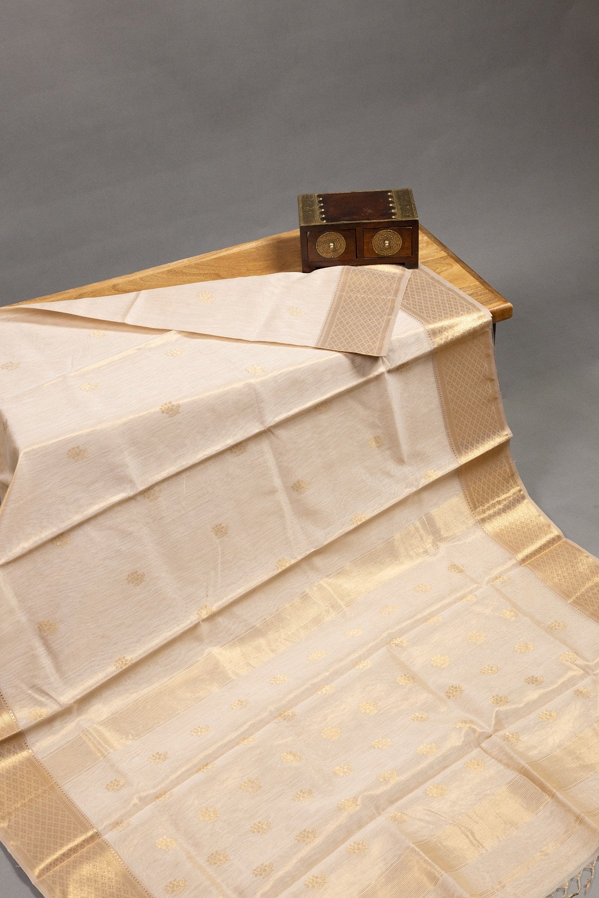 Handwoven in the luminous shades of golden cream, this Maheshwari silk saree embodies regal elegance. Adorned with timeless floral motifs, it's a whisper of tradition meeting sophistication. Embrace the art of timeless draping.