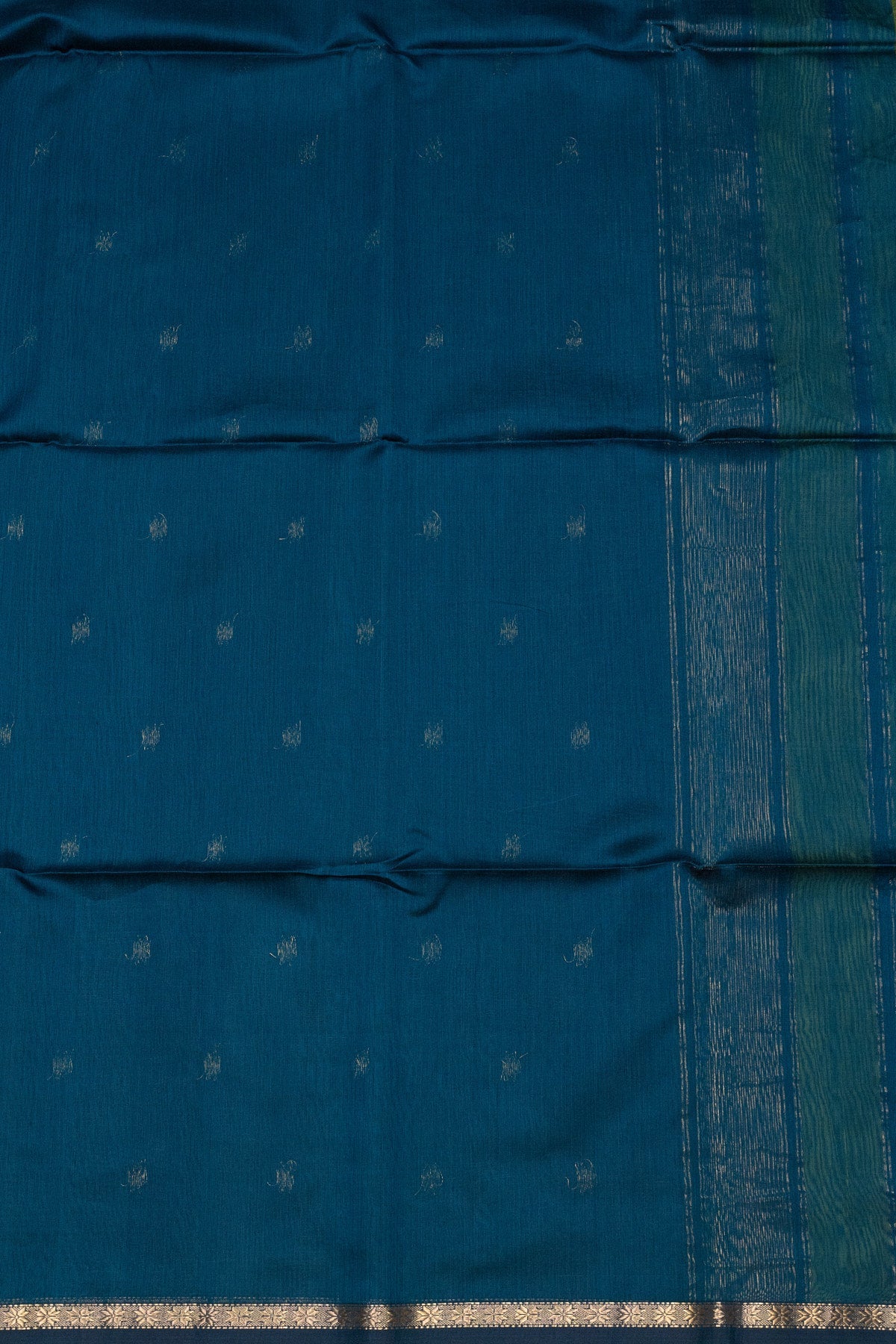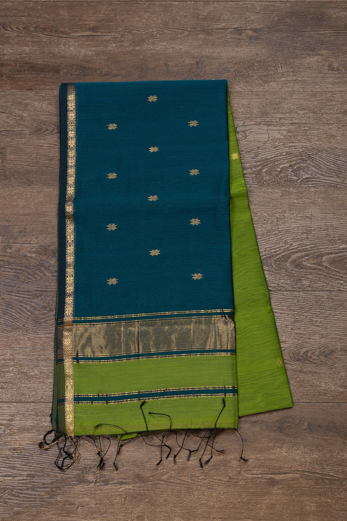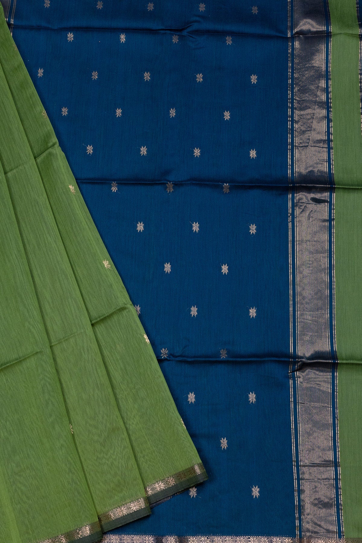 Step into elegance with our Green and Peacock Blue Maheshwari silk-cotton saree. Featuring a contrasting pallu and blouse, this saree is adorned with delicate sheer buttis that add a layer of subtle sophistication. Ideal for making a tasteful statement at any gathering.