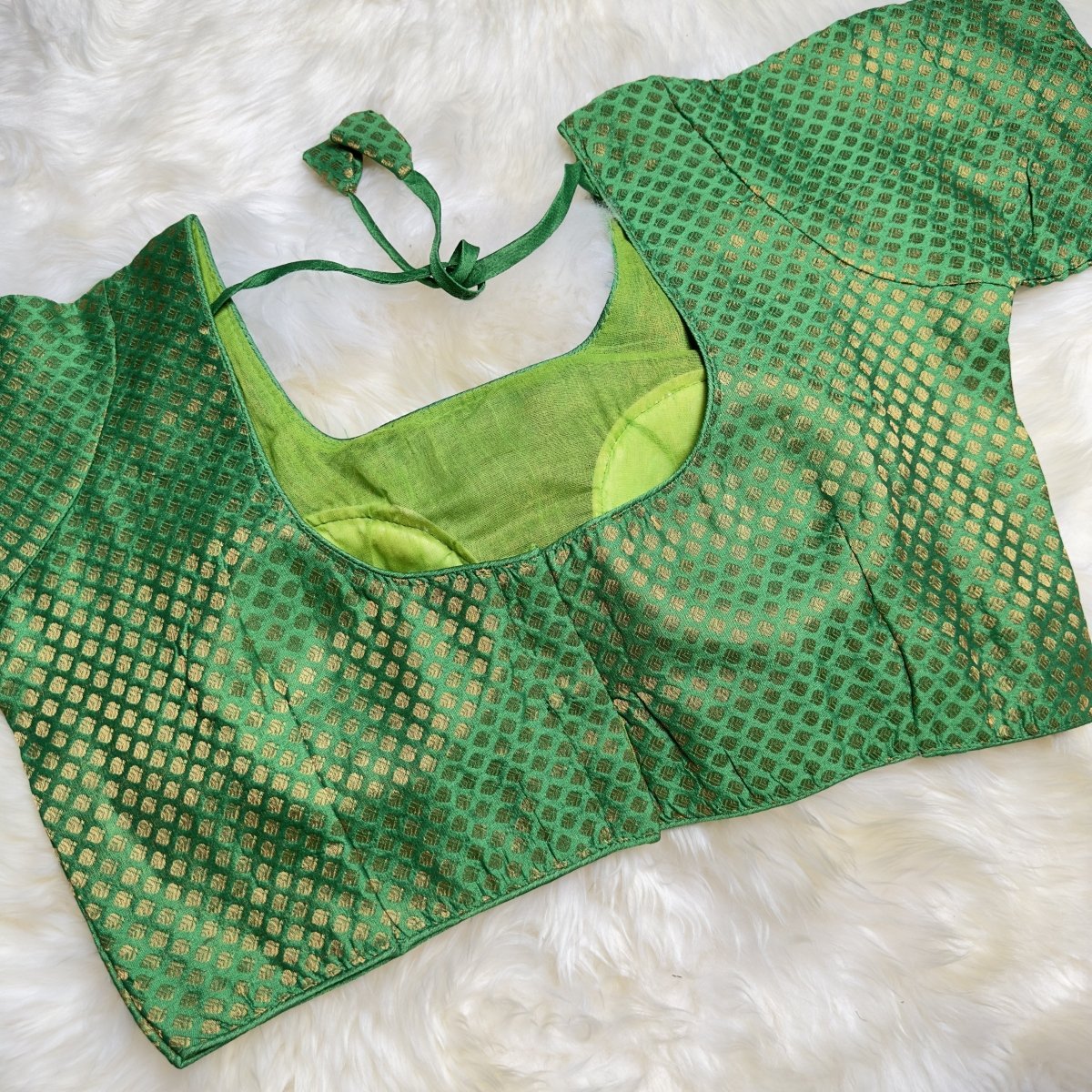 Add a touch of elegance to your ethnic wardrobe with our Green Brocade Blouse with Attached Sleeves. Crafted from luxurious brocade fabric, this blouse features a beautiful green hue adorned with intricate golden threadwork in a geometric pattern. The attached sleeves give it a classic, traditional appeal that is perfect for festive occasions, weddings, and cultural gatherings. Pair it with a saree or lehenga to create a timeless look that exudes sophistication and grace.