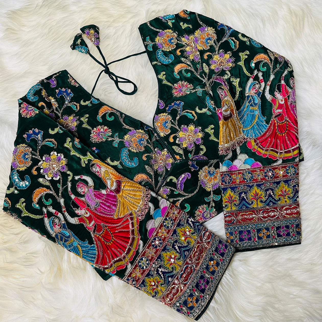 Step into sophistication with this designer green crepe blouse, an exquisite piece specially crafted for grand occasions. The blouse features intricate appliqué work and all-over embroidery highlighted with sequins, creating a stunning interplay of elegance and artistry. Its full-length embroidered sleeves make it stand out as a regal choice, blending tradition with contemporary fashion. Perfectly tailored to fit sizes 32 to 40, this blouse is a statement masterpiece that pairs beautifully with silk sarees, lehengas, or festive drapes. Truly a luxurious design for weddings, receptions, and cultural celebrations.
