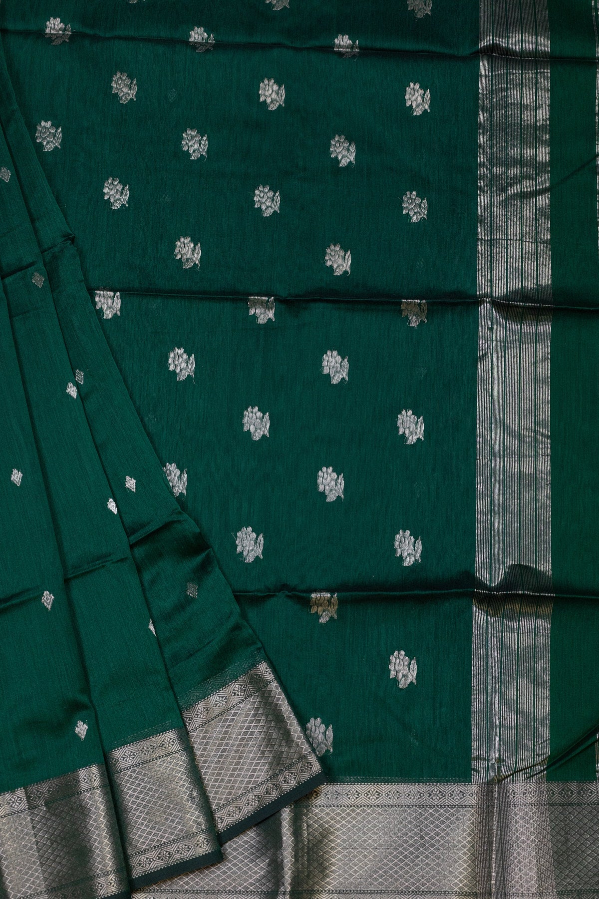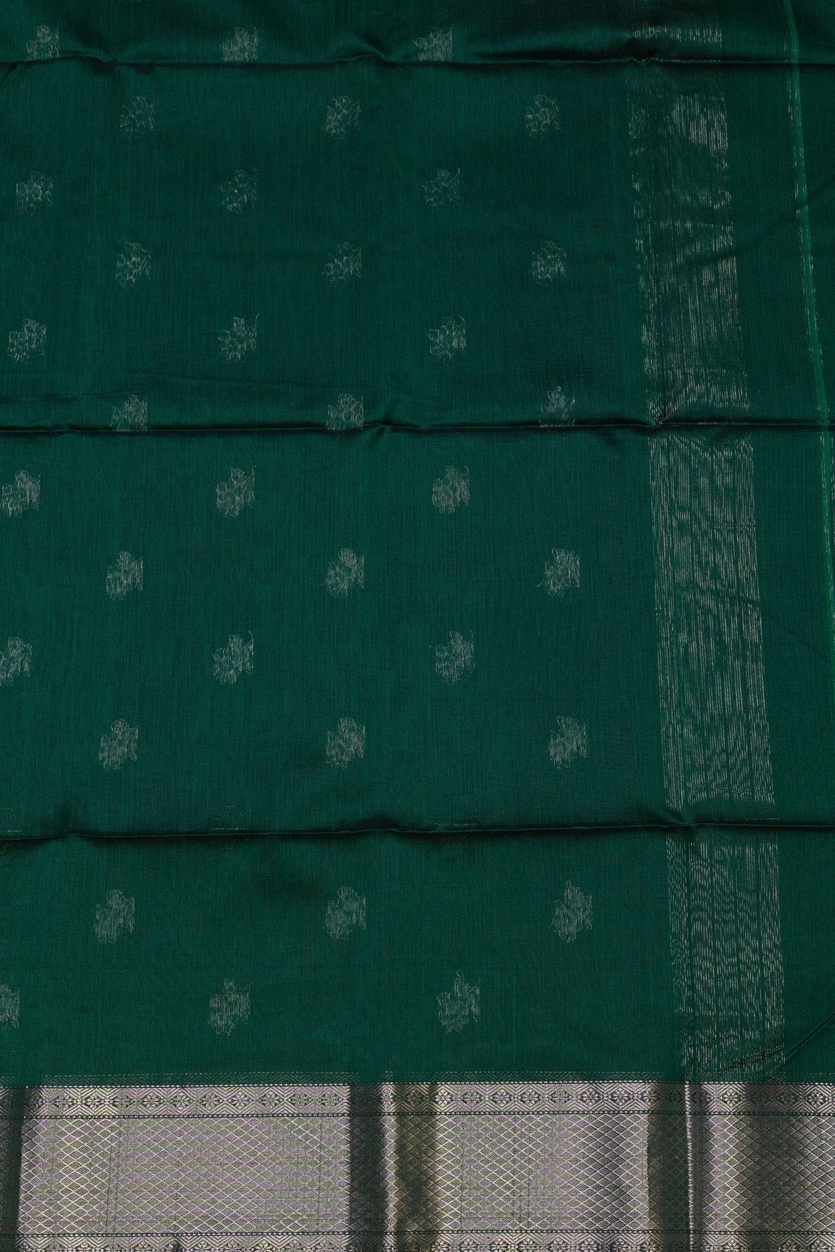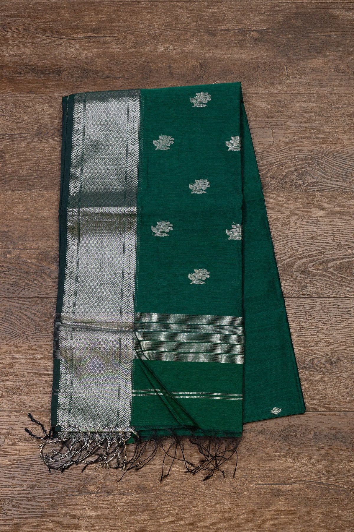 Unveil your grace with this exquisite green Maheshwari silk-cotton saree. Adorned with elegant rose buttis and framed by shimmering silver zari borders, this saree embodies both tradition and modern charm. It's the perfect choice for a sophisticated and unique look.