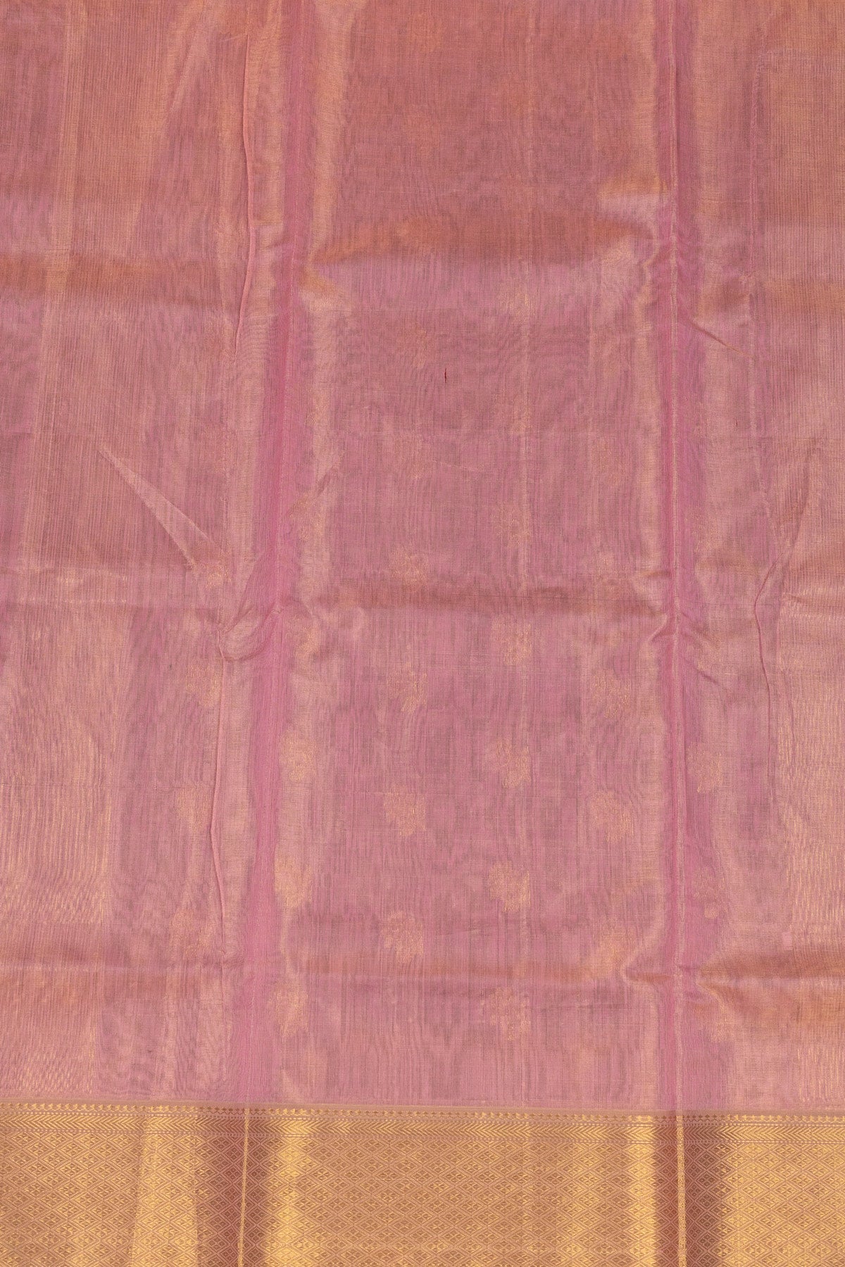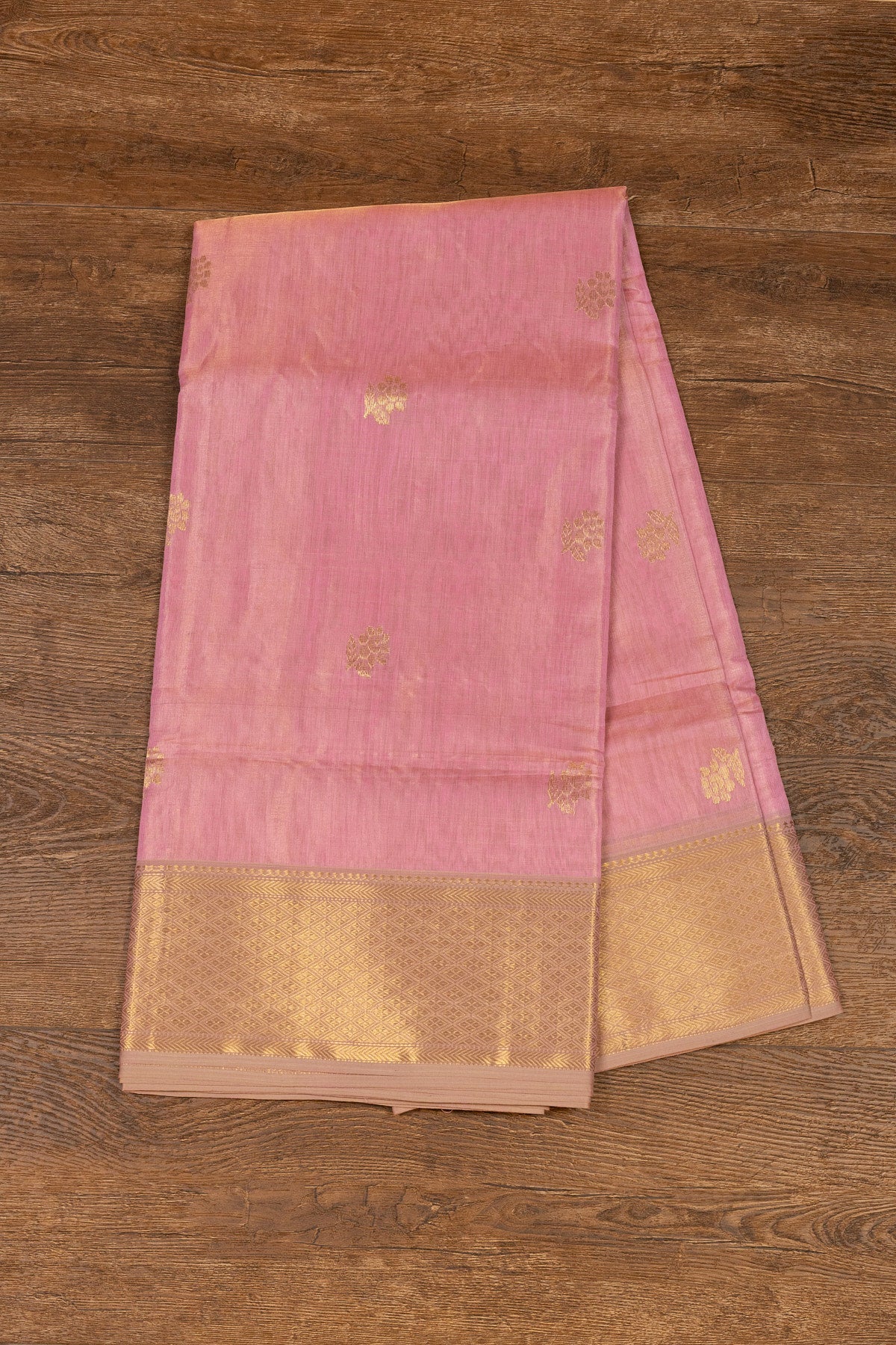 Hand-woven in exquisite Maheshwari silk, This pink tissue saree glistens with elegance. Delicate floral buttis enhance its timeless beauty.