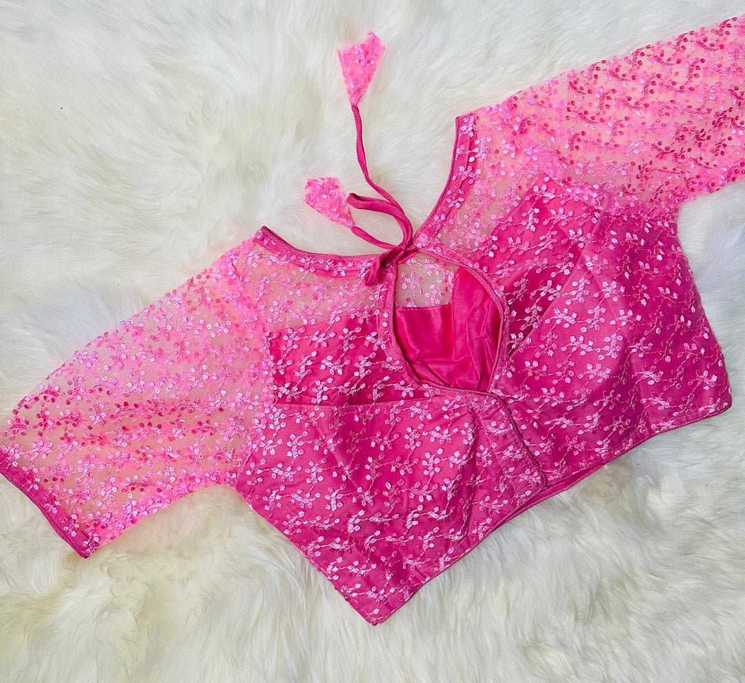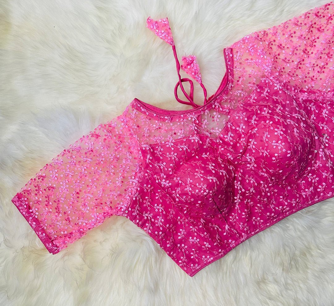 The baby Pink Netted Blouse with Sparkling Sequin Embellishments is a lovely and elegant piece that exudes femininity and grace. The delicate netted fabric and intricate sequin embellishments add a touch of sparkle and charm to the design, while the soft pink color gives it a sweet and romantic feel. This blouse is perfect for any special occasion or evening event, and is sure to make you feel pretty and confident.