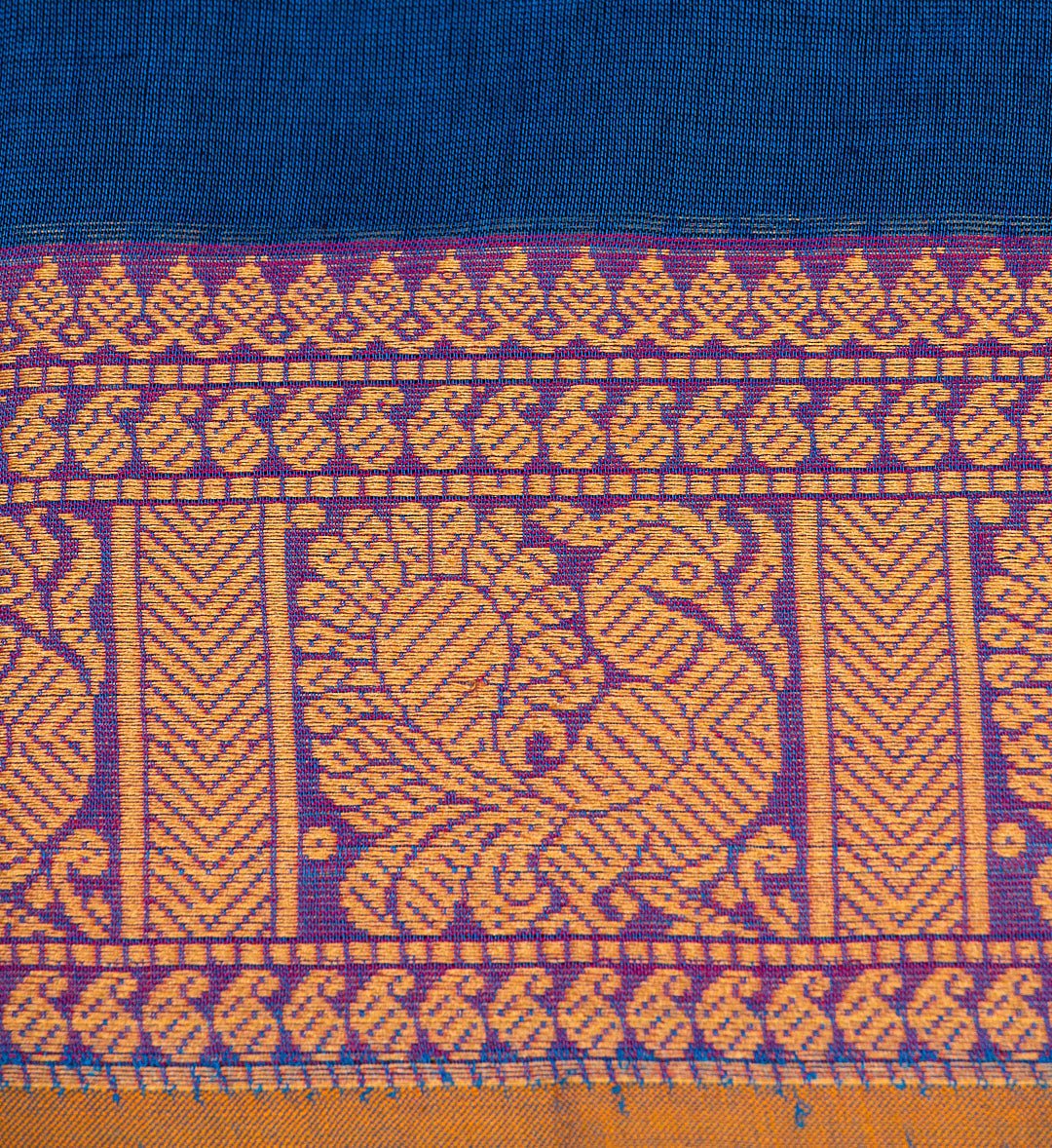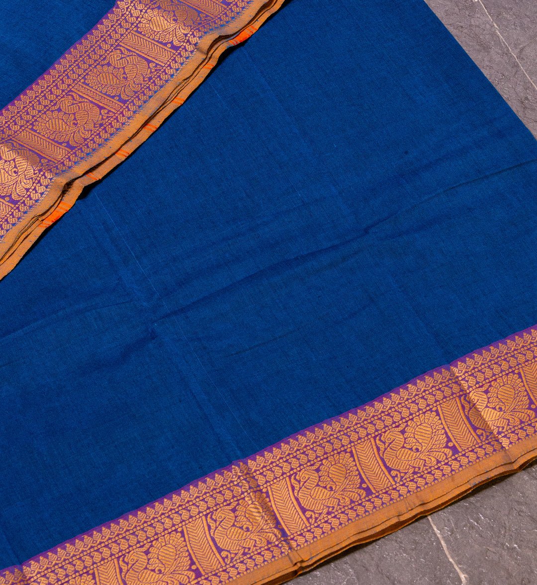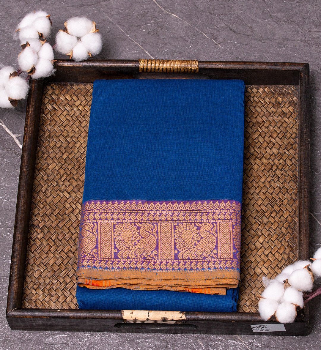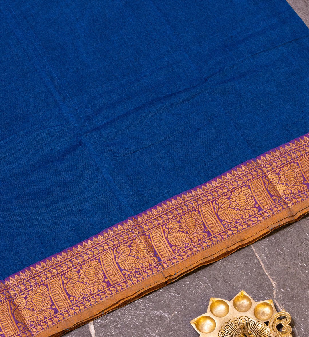 Introducing "Regal Splendor" - the exquisite Ajanta Blue and Gold Thread Peacock Border Chettinad Cotton Saree, perfect for the modern-day woman who loves to exude grace and elegance.