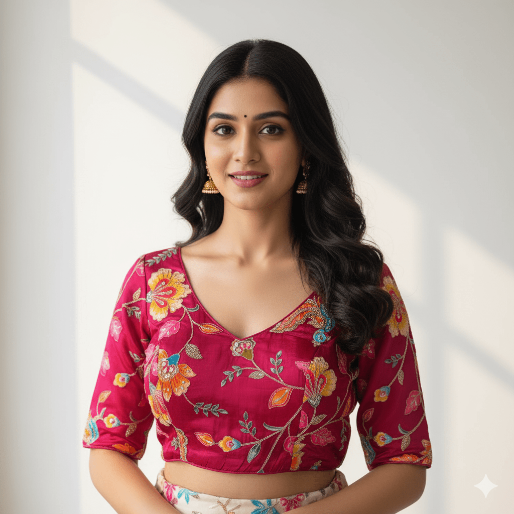 Royal Pink Viscose Crepe Blouse with Handcrafted Embroidery & Mid-Length Sleeves (Free Size 32–40)