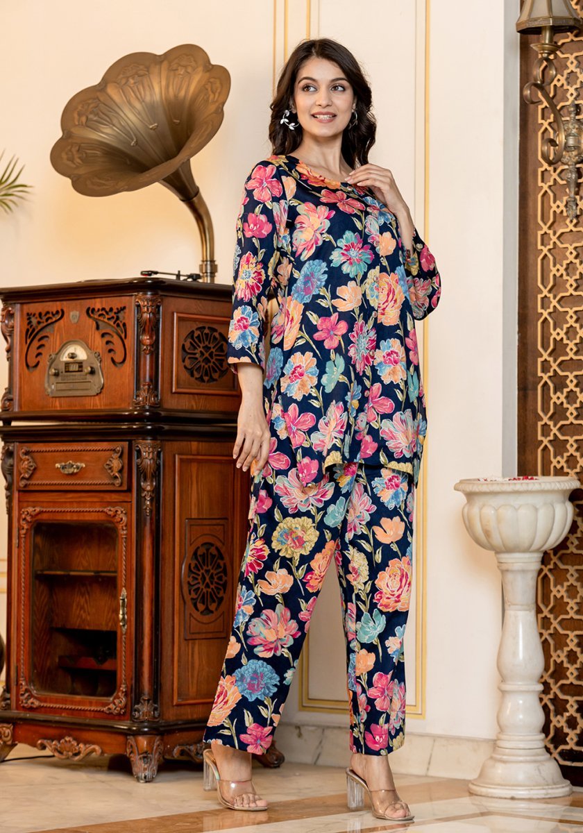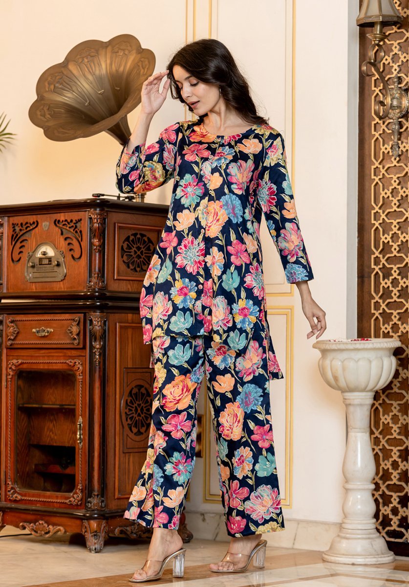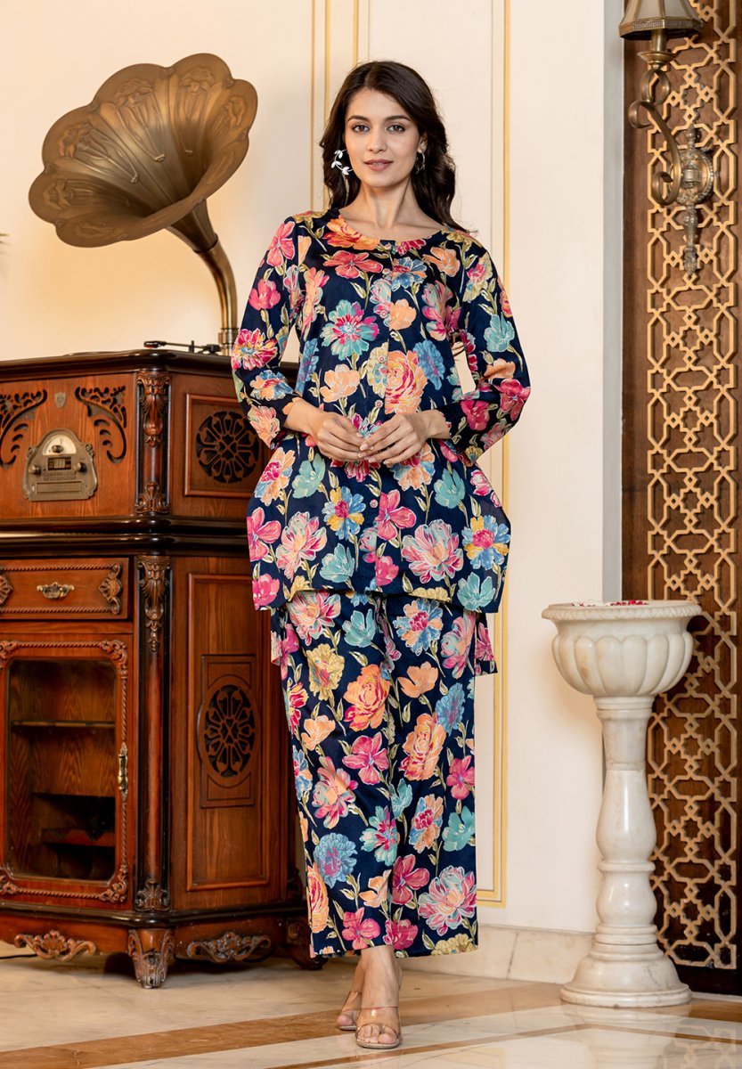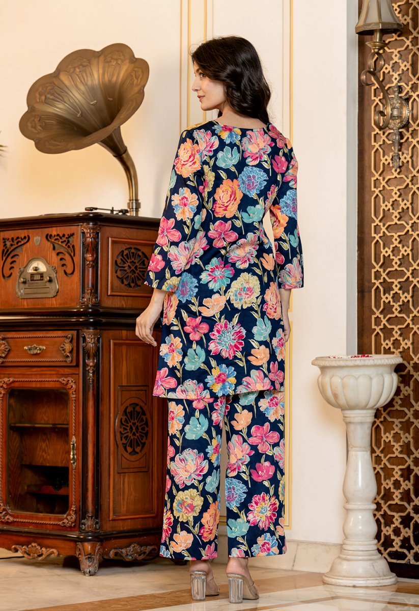 Serene Blue Floral Printed Butter Cotton Co - Ord Set - swadeshsouq.com