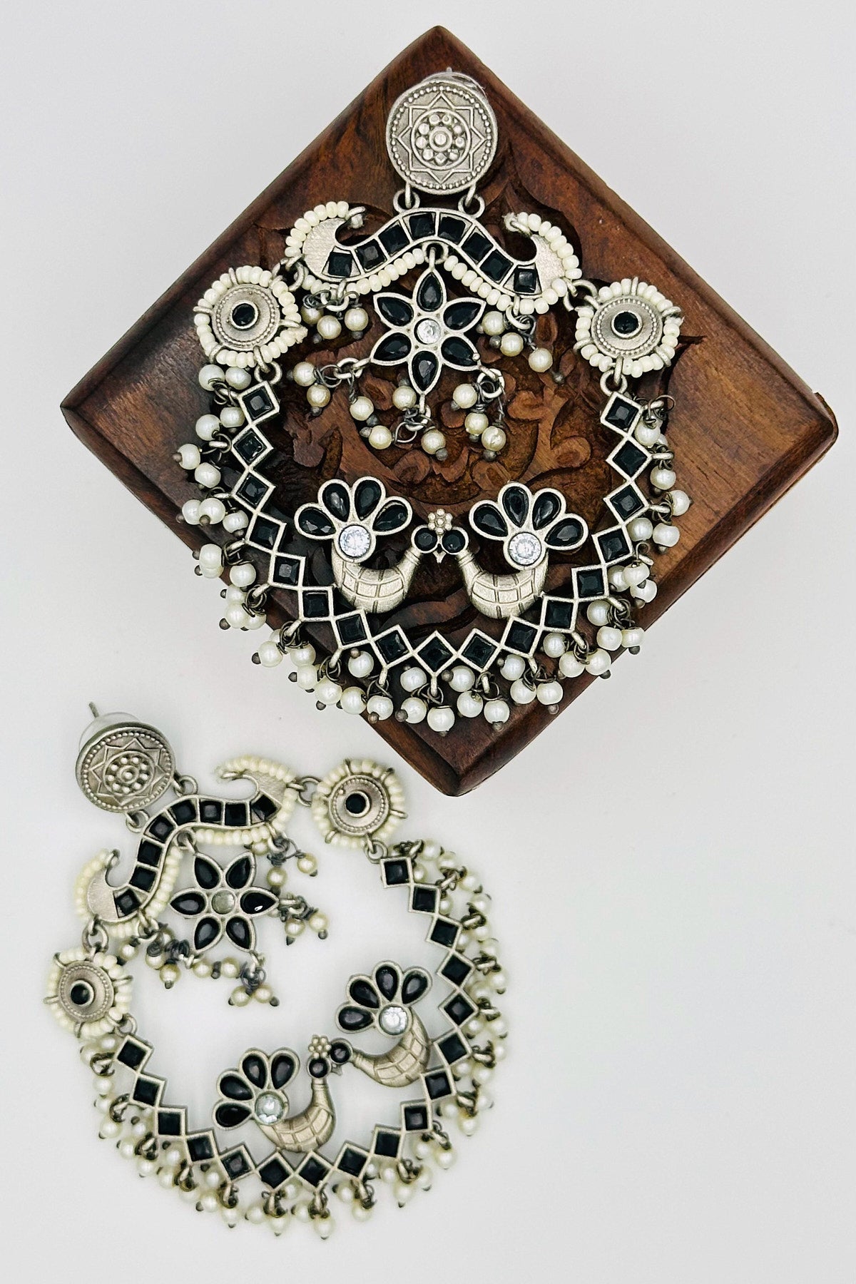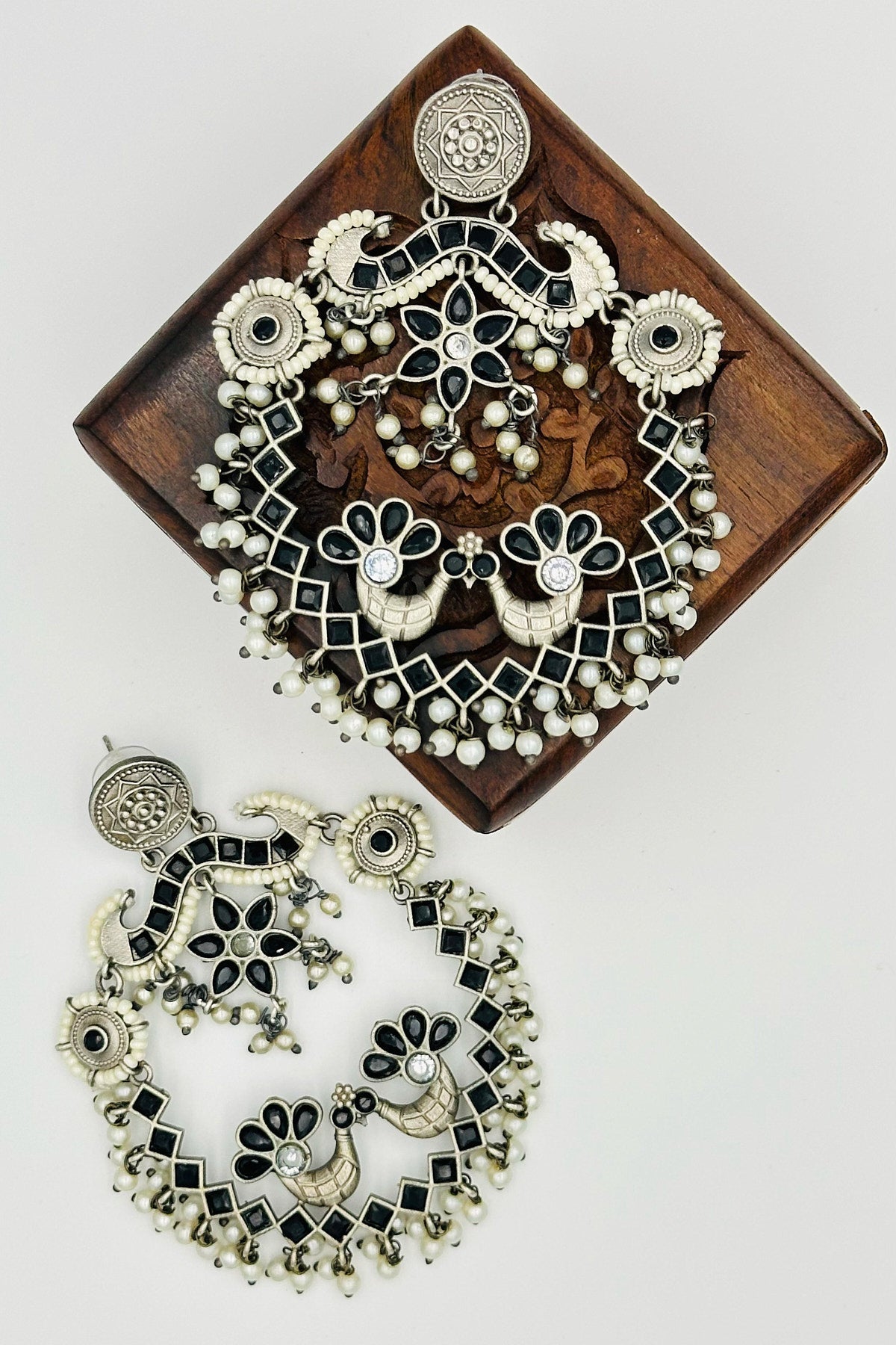 Silver Peacock Chandbali Earrings with Pearls and Black Stones - swadeshsouq.com