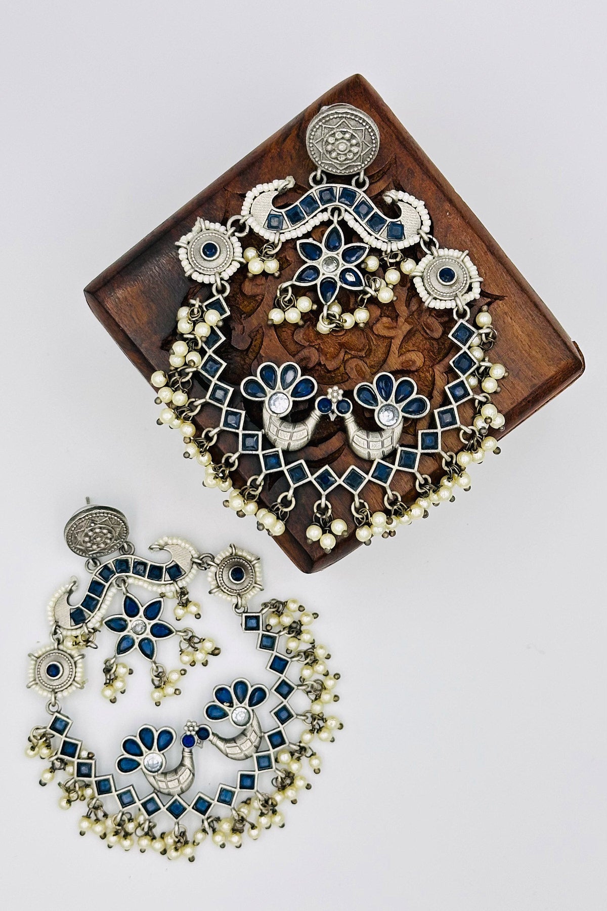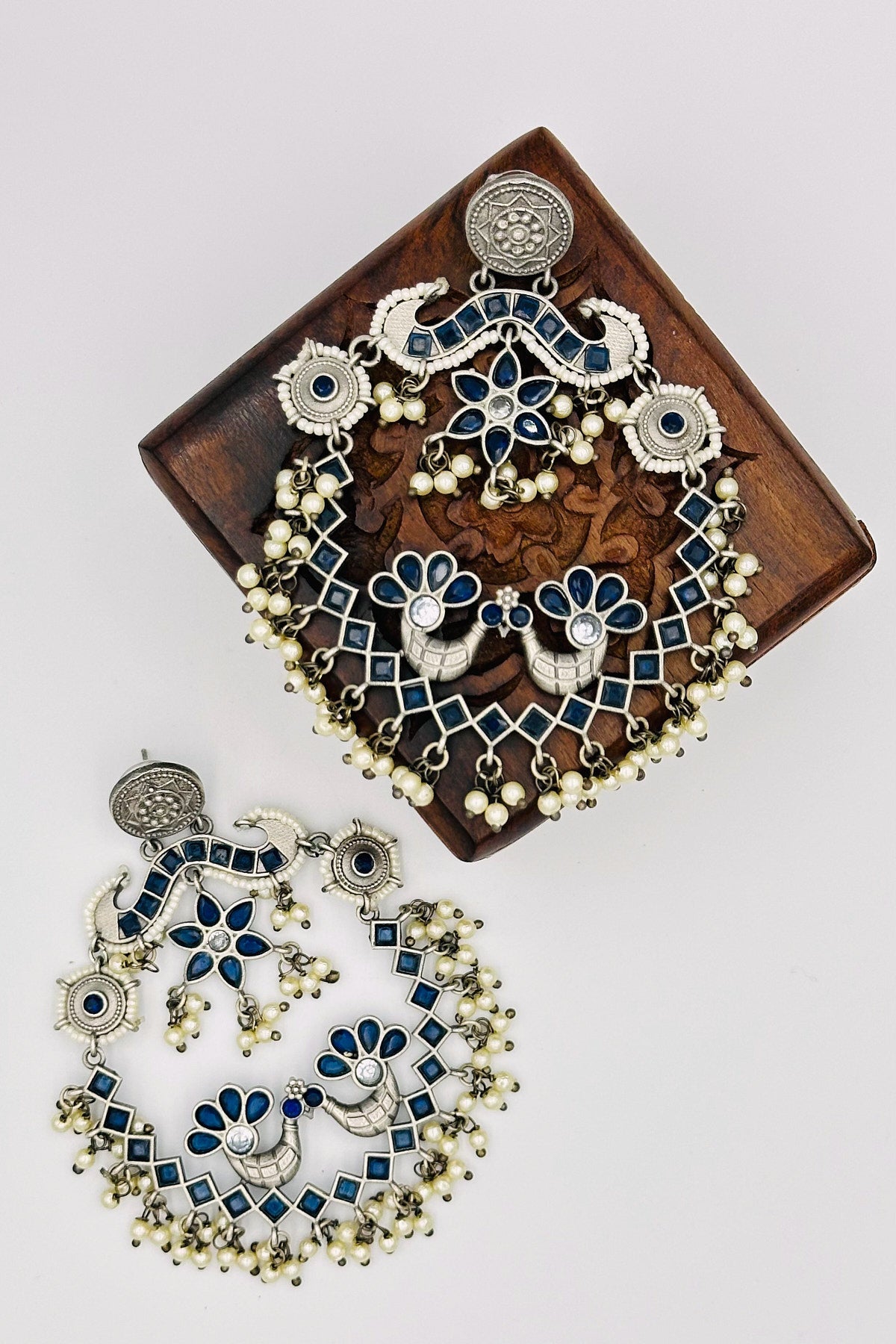 Experience the allure of our Sapphire Blue Stone Peacock Chandbali Earrings. Crafted with precision, these silver earrings showcase an intricate peacock design complemented by lustrous pearls and the deep, serene hues of sapphire blue stones. Elevate your elegance with a touch of sophistication that exudes timeless charm.