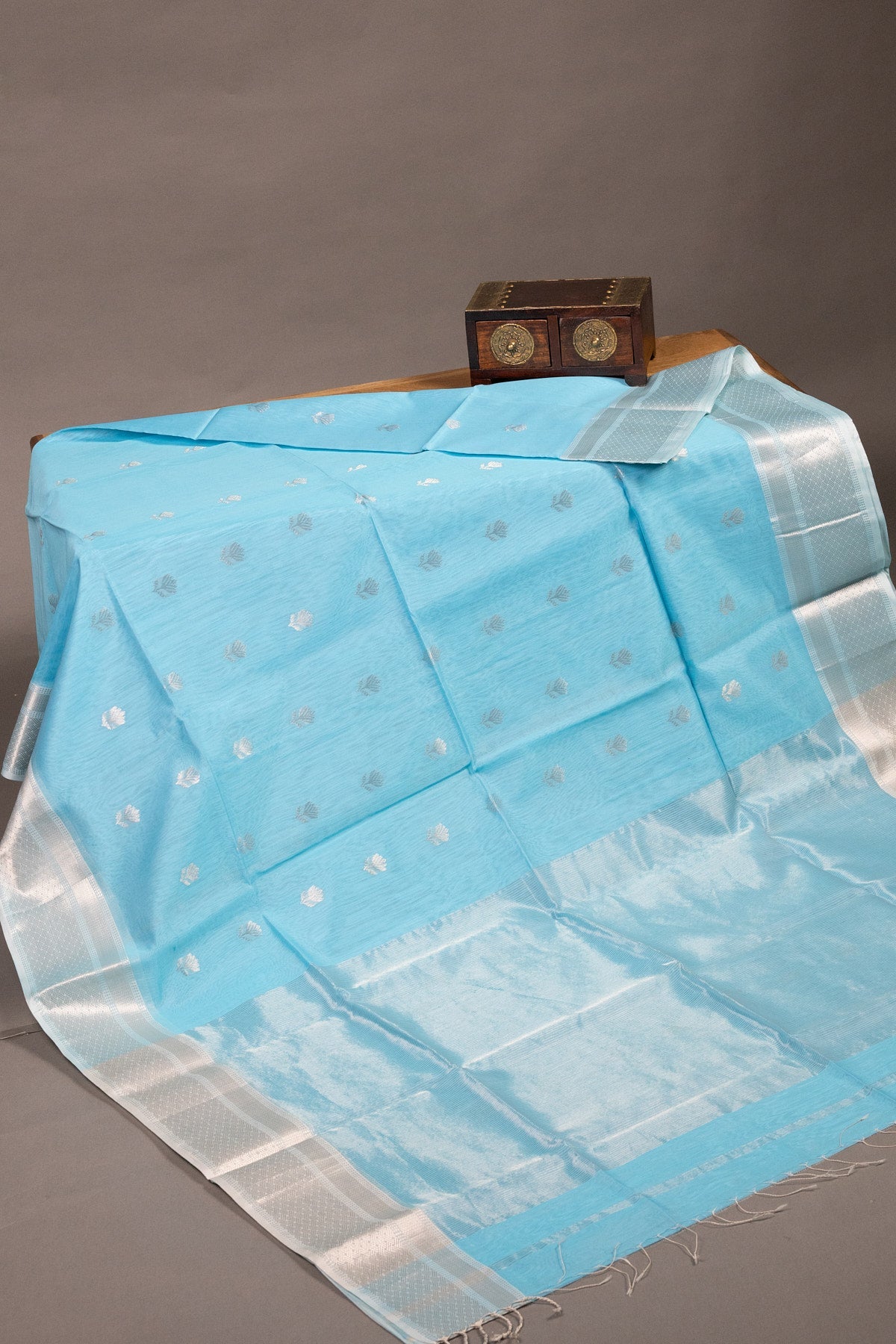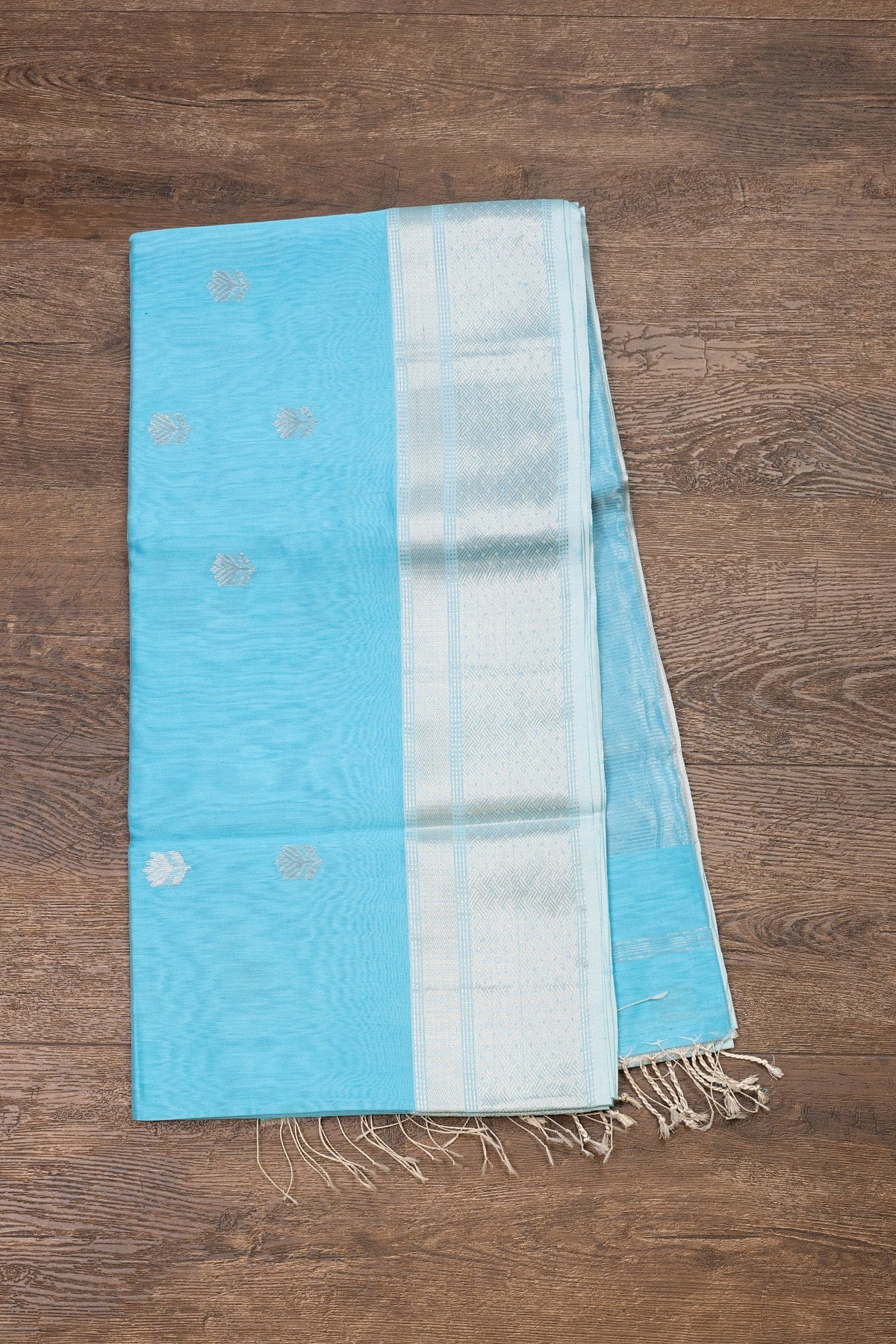 Sky Blue Maheshwari Silk-Cotton Saree with Silver Zari Lotus Buttis - swadeshsouq.com