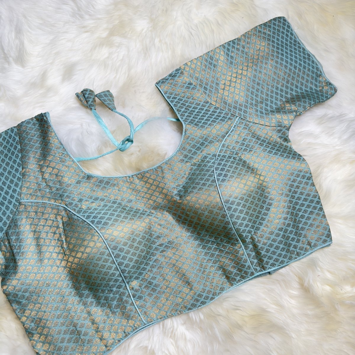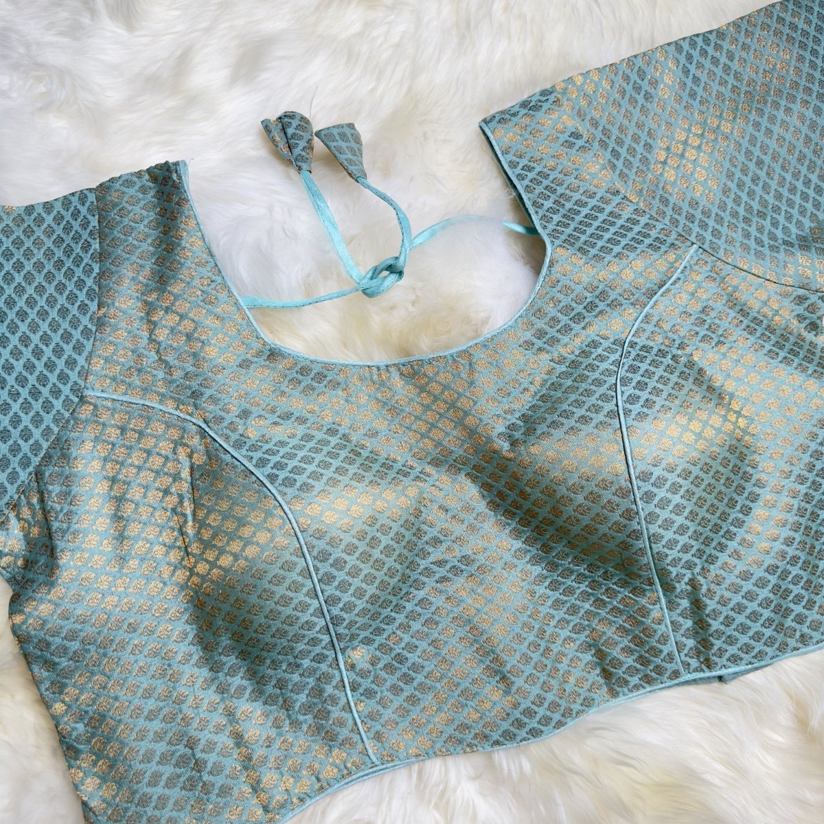 Step into elegance with our Sky Blue Silk Blouse with Attached Sleeves. Featuring a beautiful sky blue hue with delicate golden accents, this blouse is crafted from luxurious silk that offers a sophisticated look perfect for weddings, festive occasions, or celebrations. The attached sleeves add a touch of classic charm, while the tailored fit accentuates your curves, ensuring you look your best with any saree or lehenga.