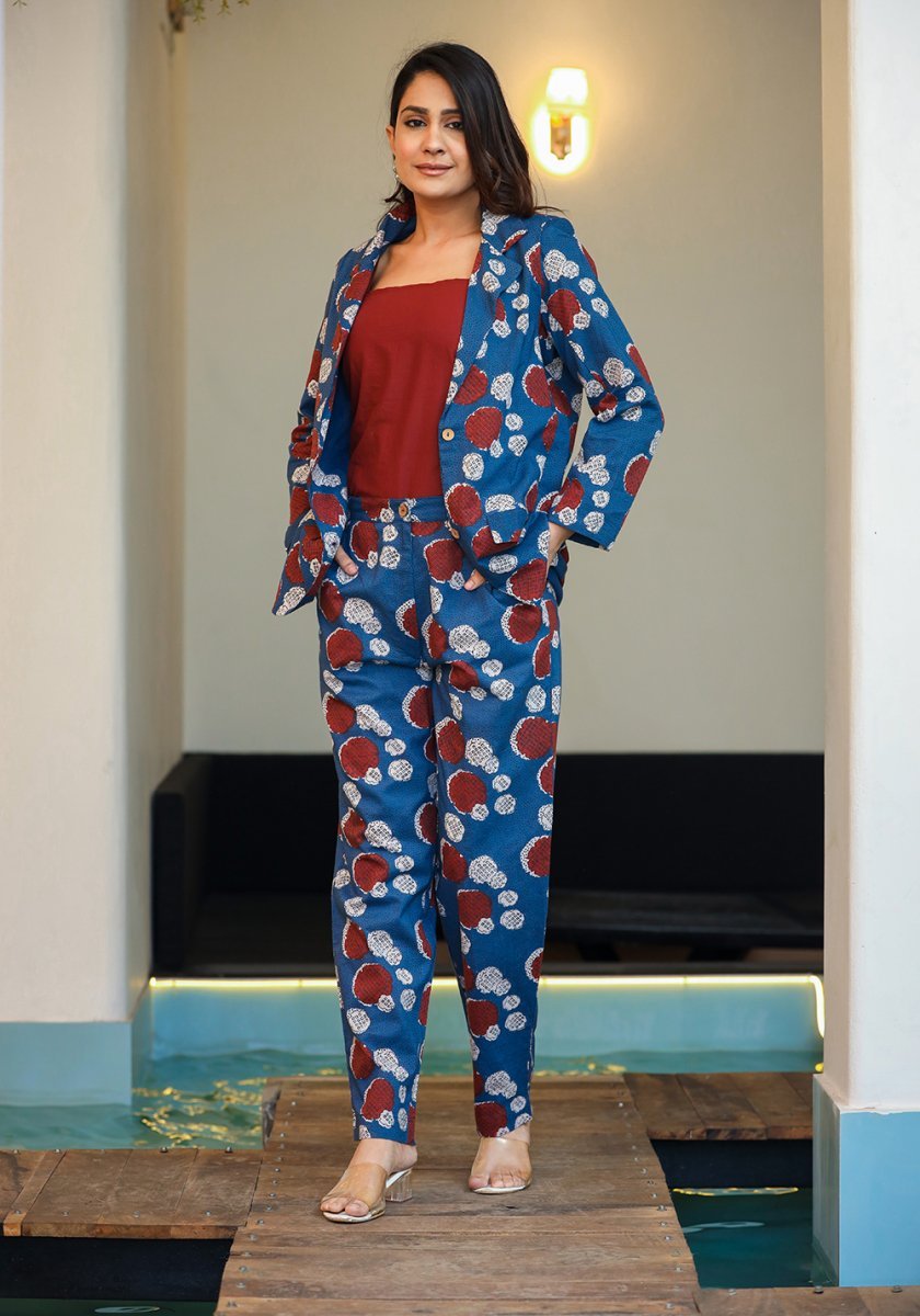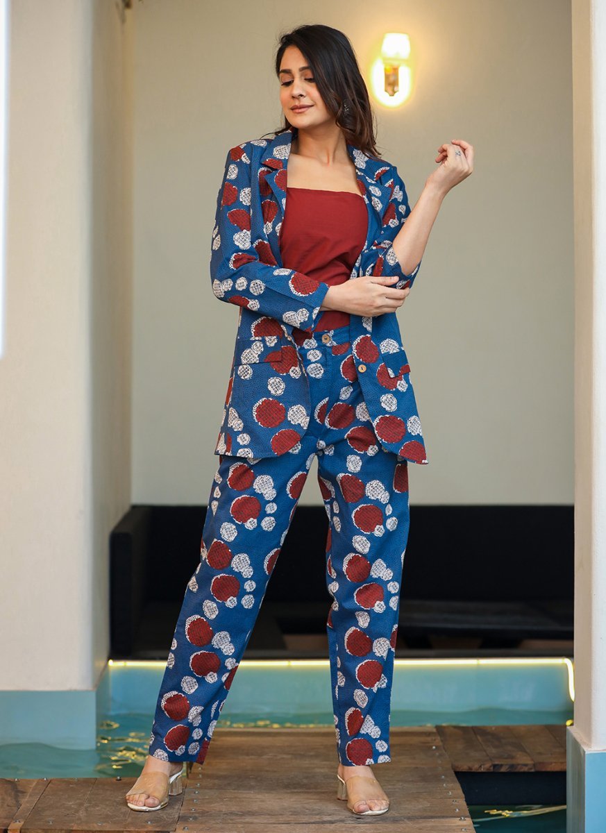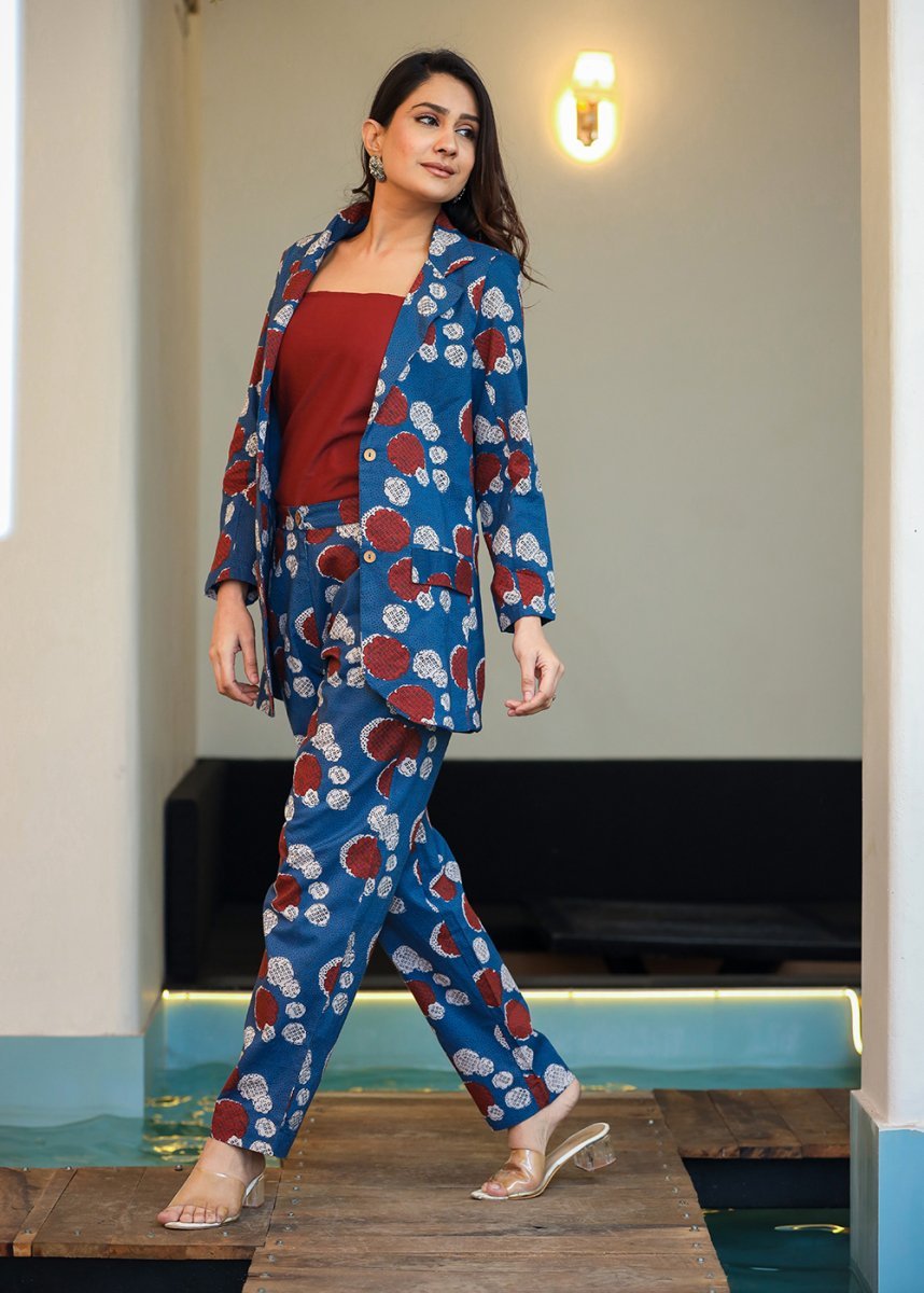 Stylish Blue Printed Three-Piece Blazer Co-Ord Set