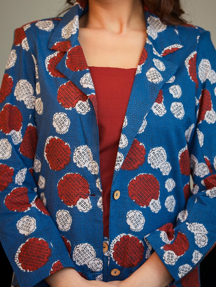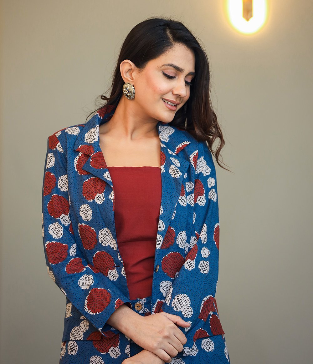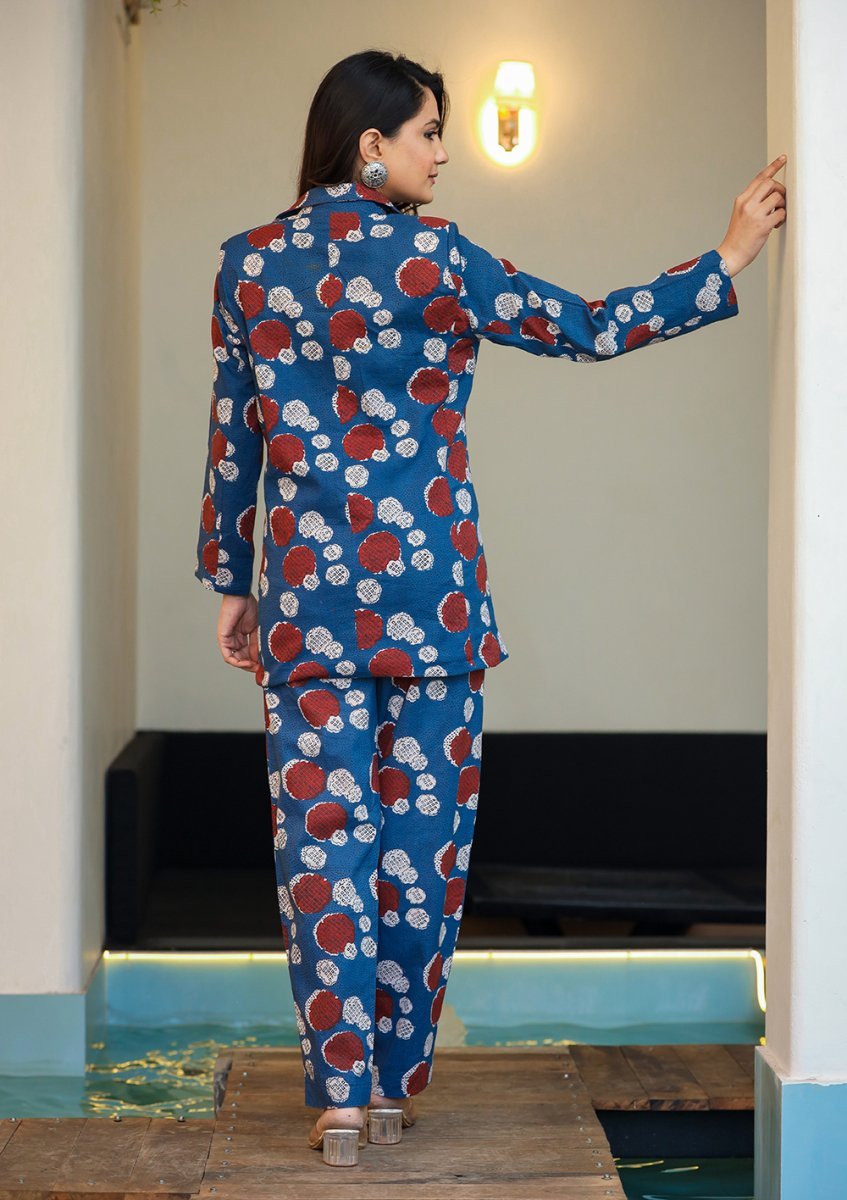 Stylish Blue Printed Three-Piece Blazer Co-Ord Set