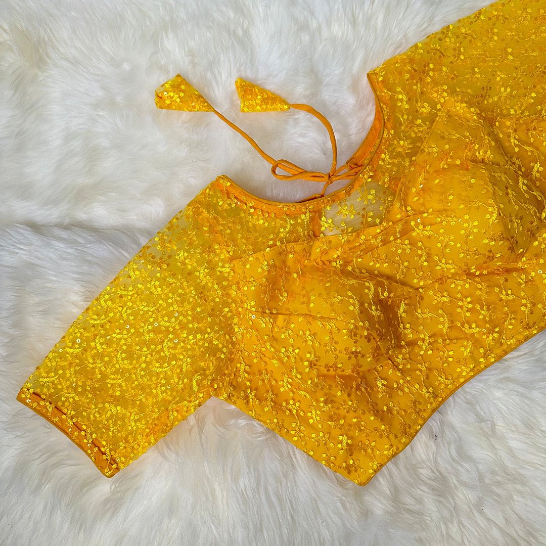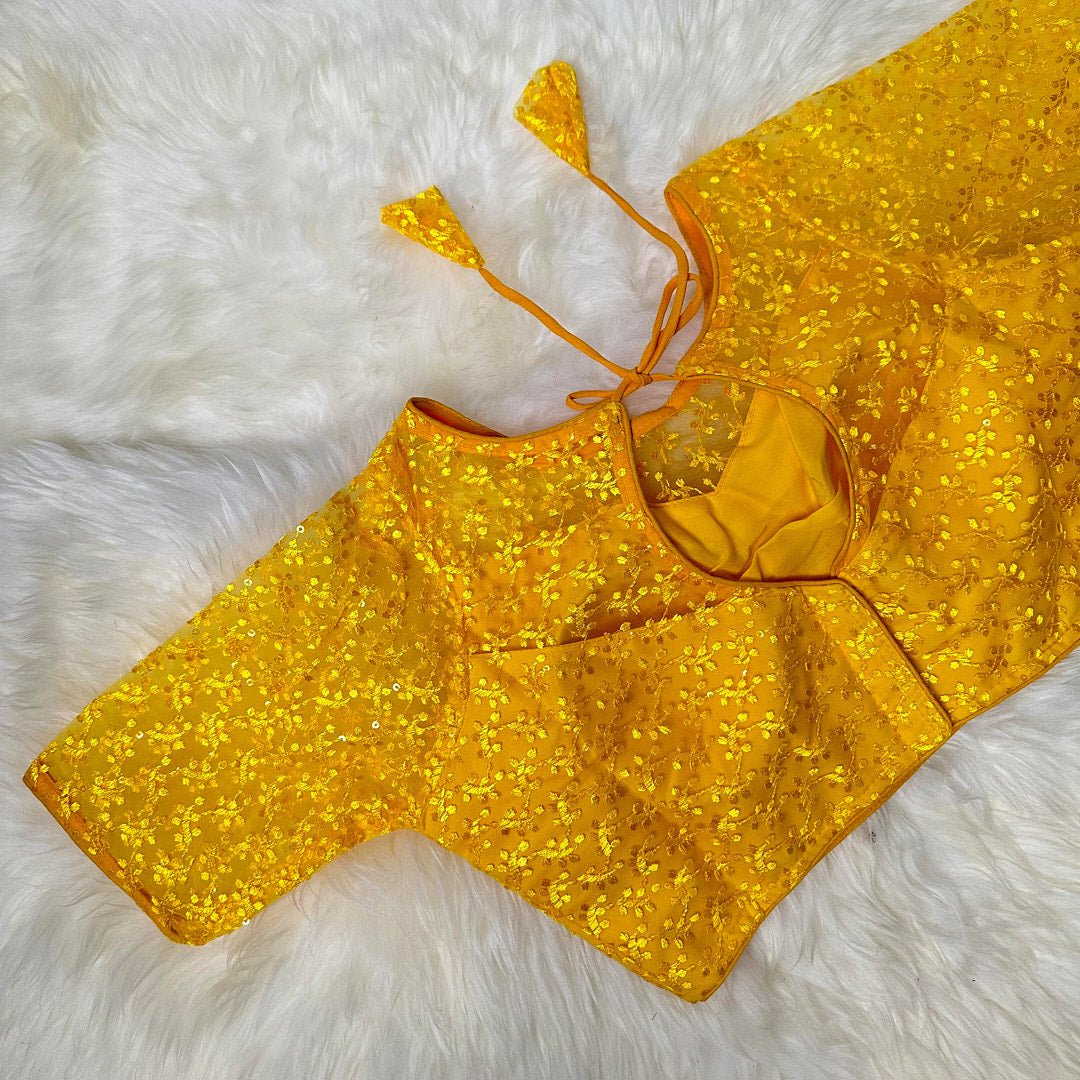 Sunshine Sparkle: Yellow Raschel Netted Blouse with Sequin Embellishment.