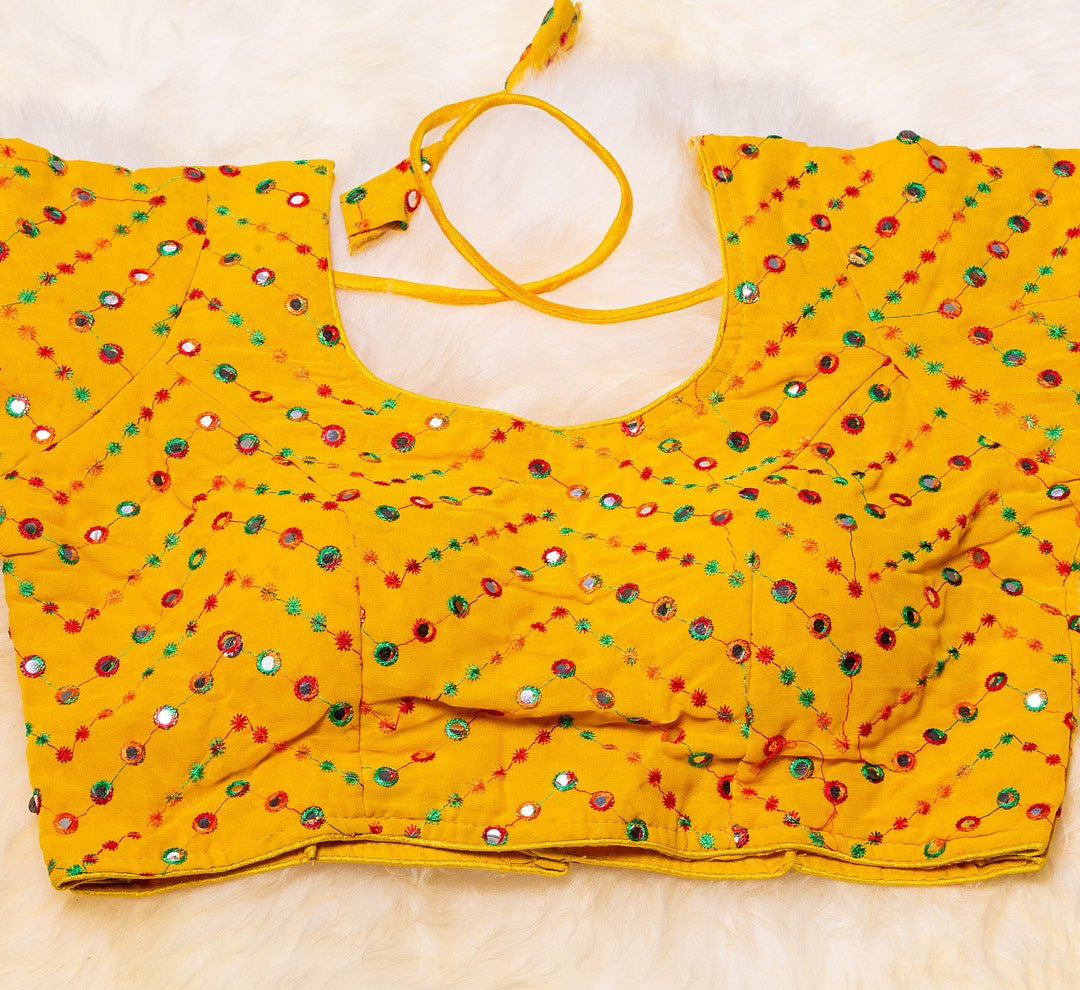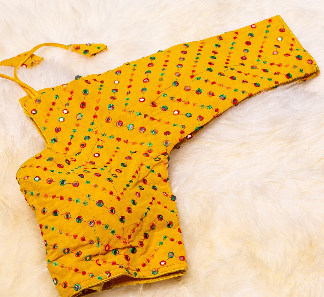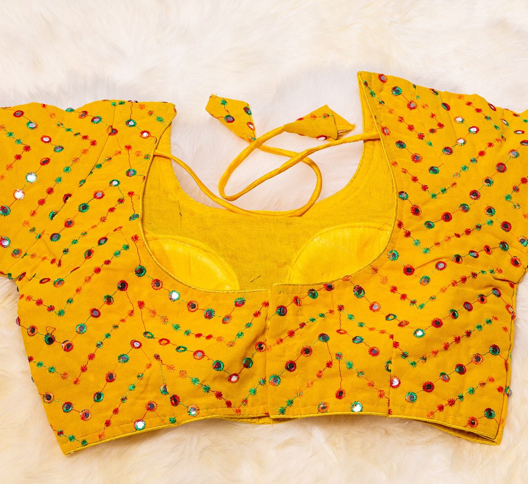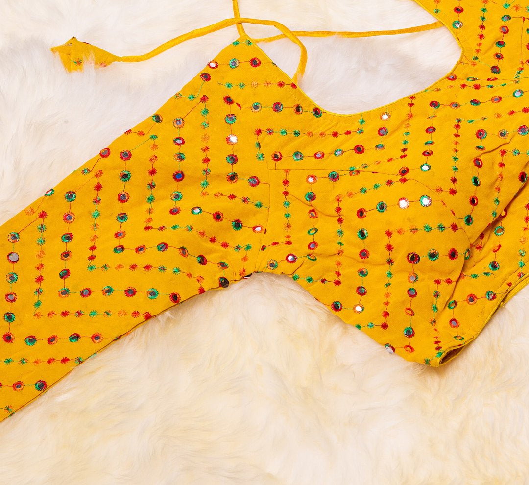 Our "Sunshine Yellow Mirror Embroidered Blouse with Elegant Long Sleeves" also includes latkans, which add a traditional touch to the overall design. The latkans complement the mirror embroidery beautifully and complete the look perfectly.