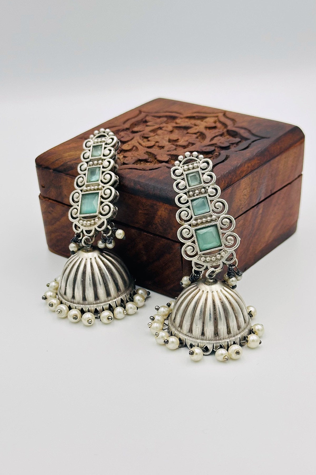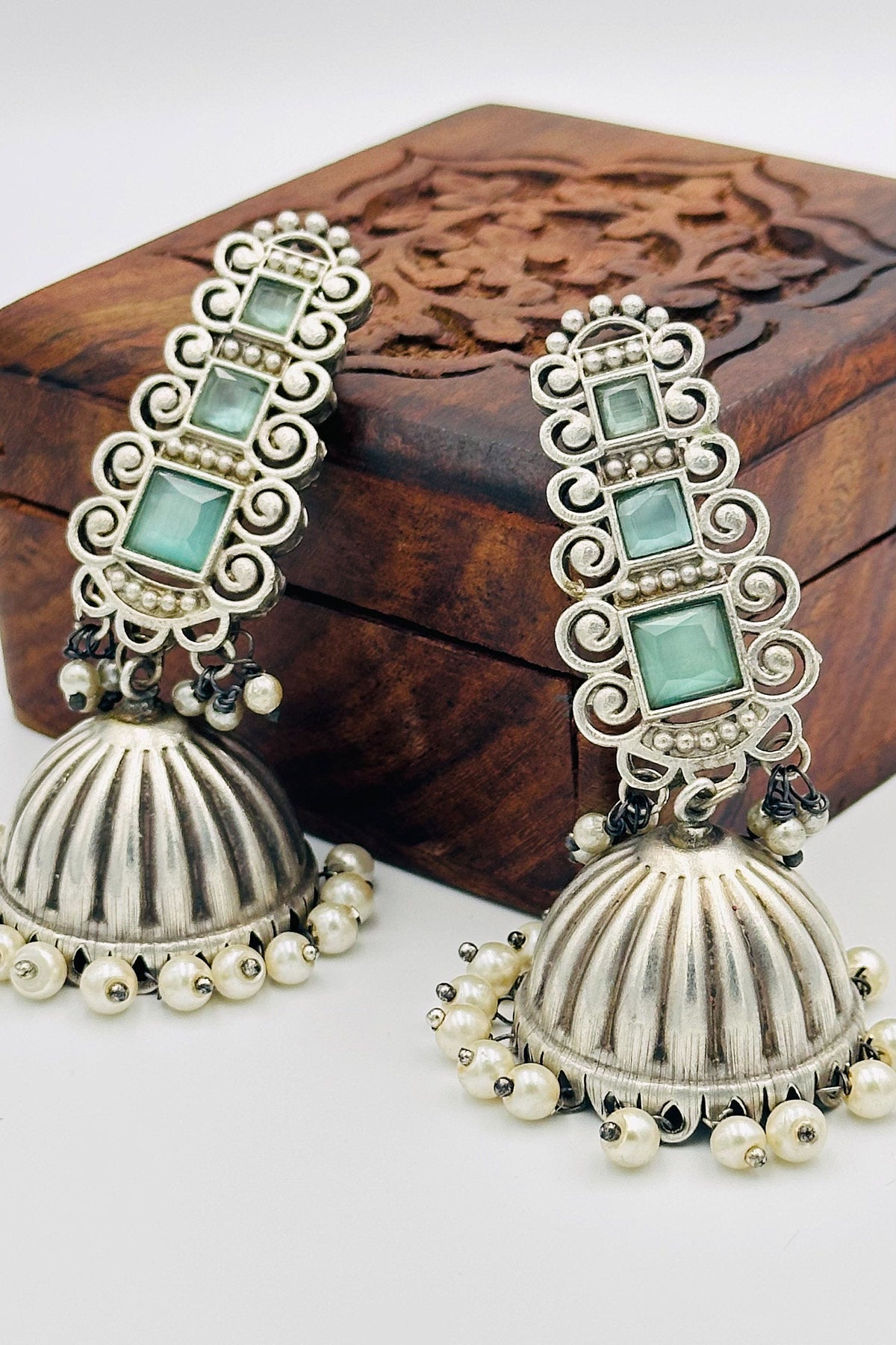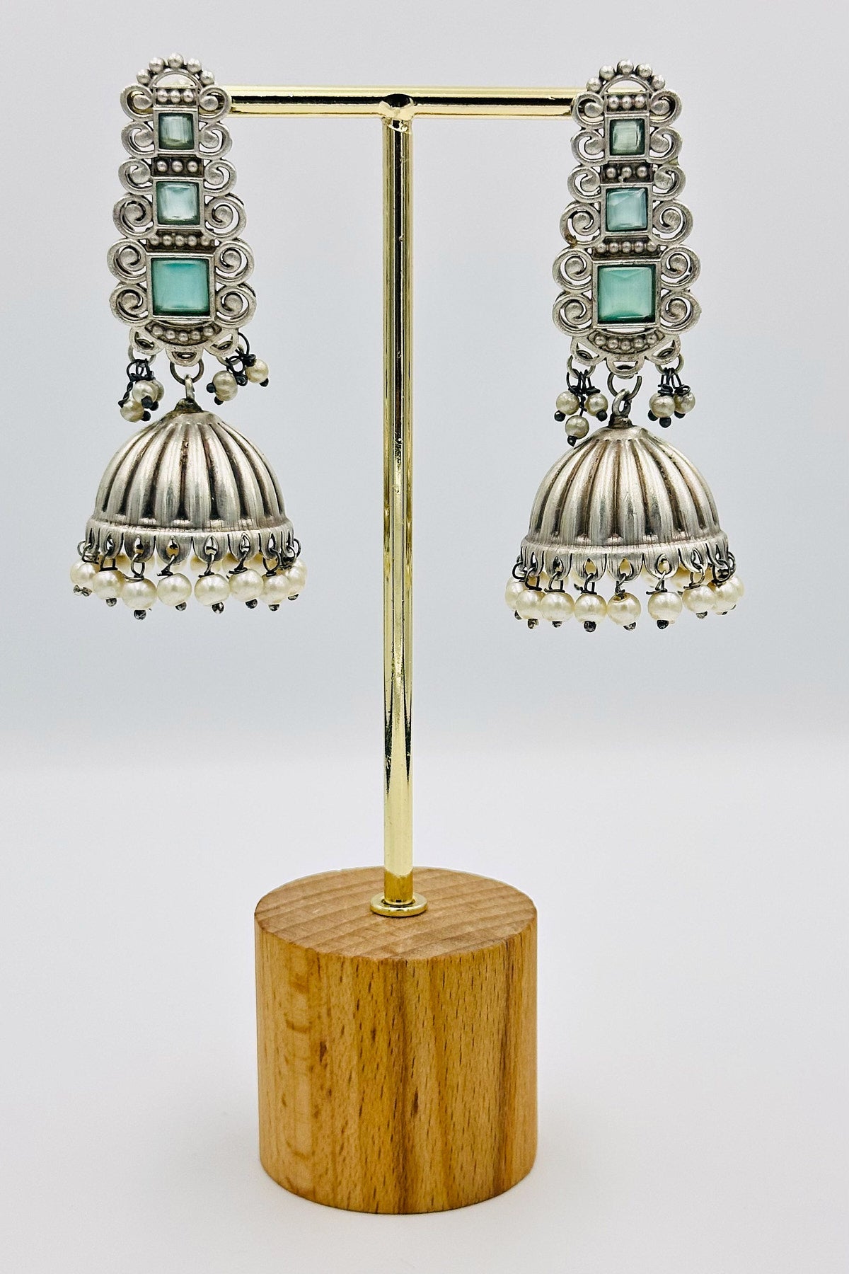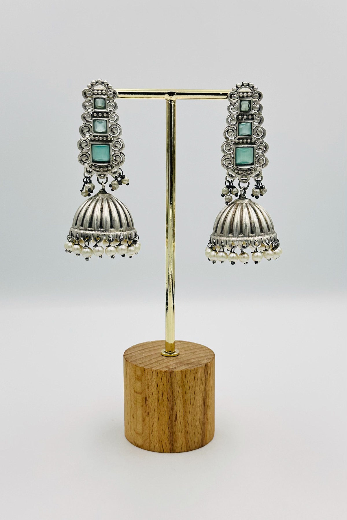 Turquoise Elegance: Silver Jhumkas with Pearls - swadeshsouq.com